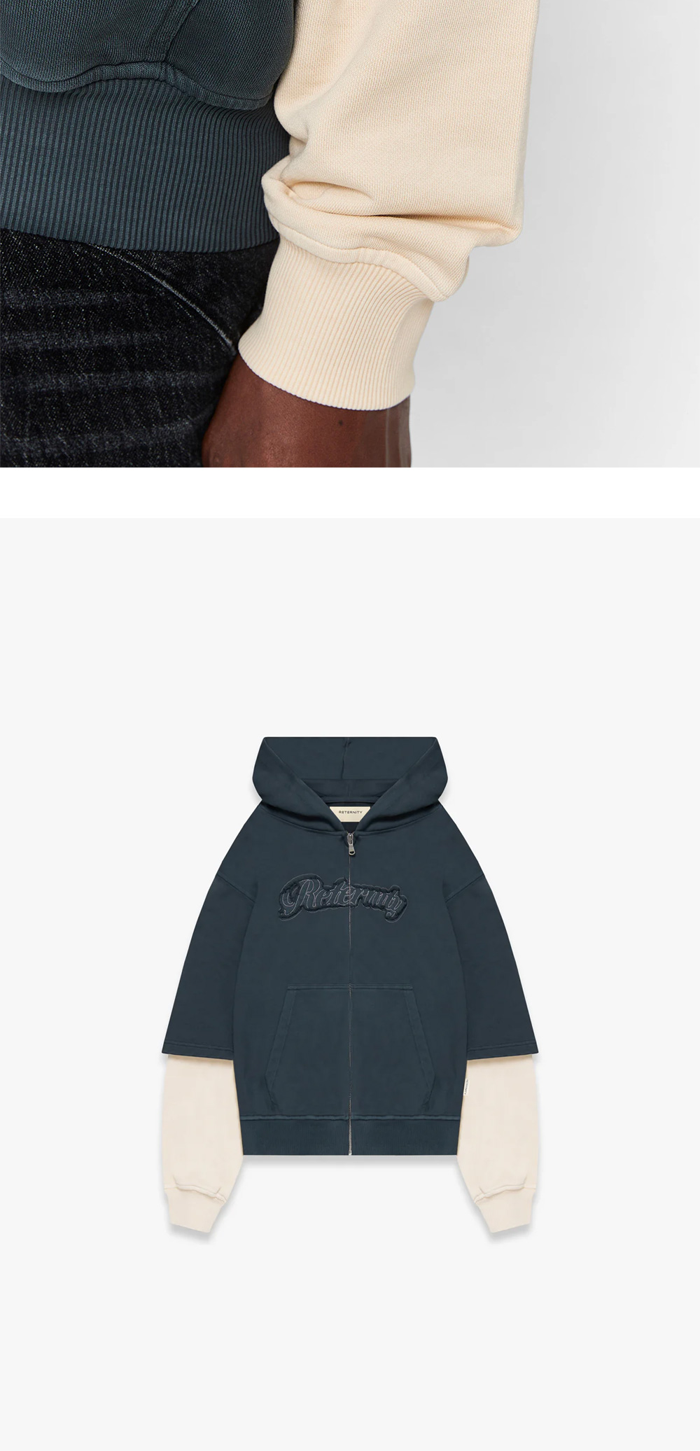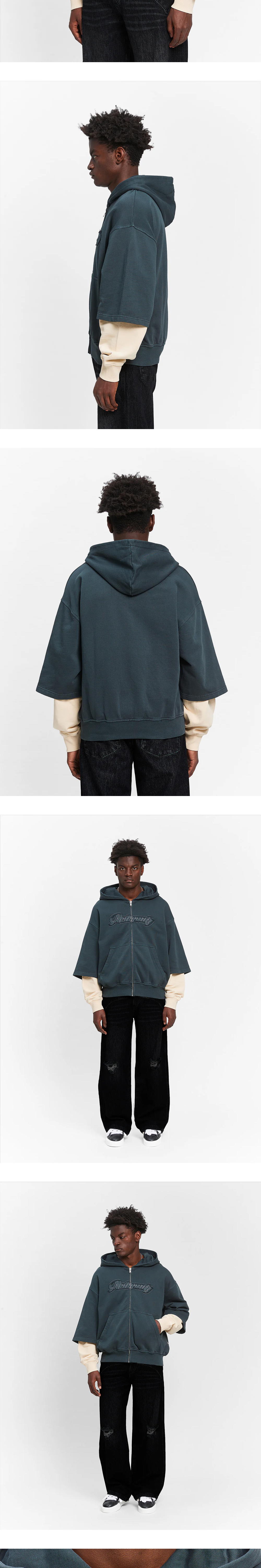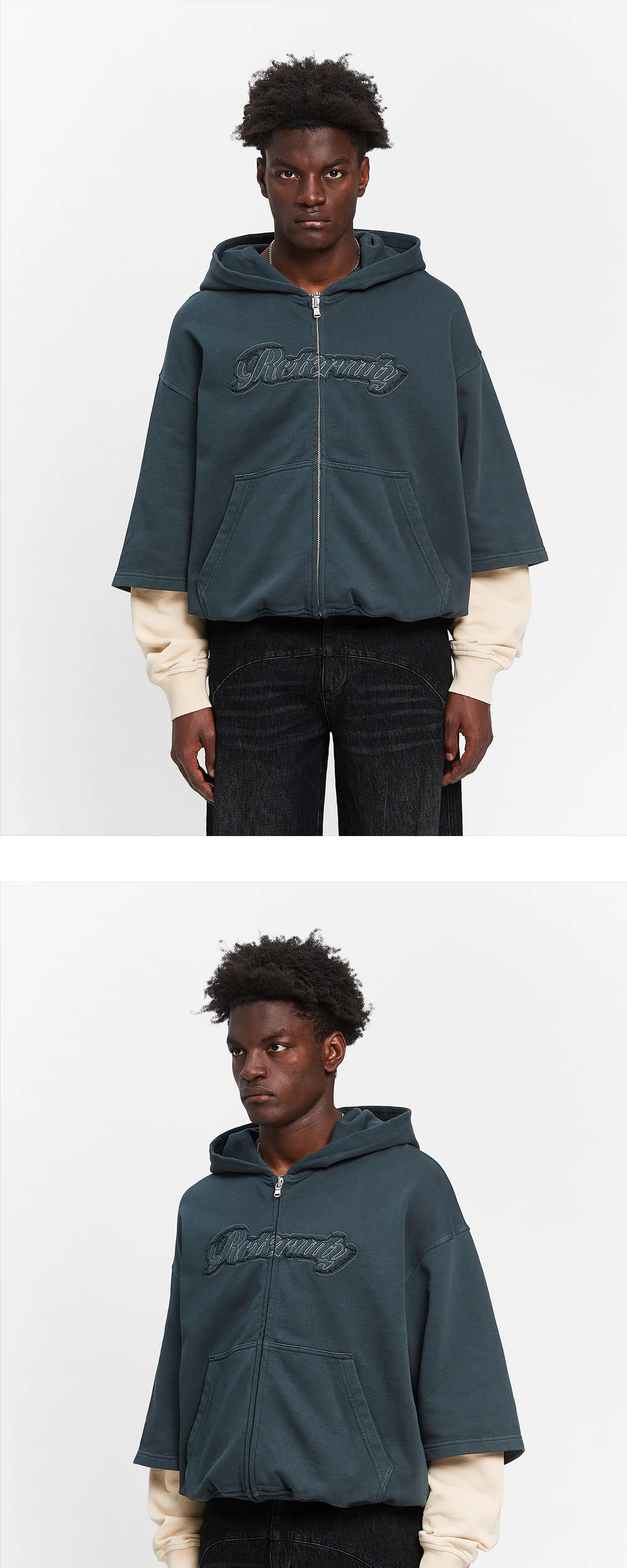 예술 및 공예 운동에서 영감을 받은 리터니티의 레이어드 집 후디입니다. - 앞면에 원단 적용 - 100% 면 450gsm - 롱슬리브 레이어드 룩 - 크롭 박스형 핏 - 유럽에서 수작업으로 제작 * 모델 스펙: 185cm, L 사이즈 착용