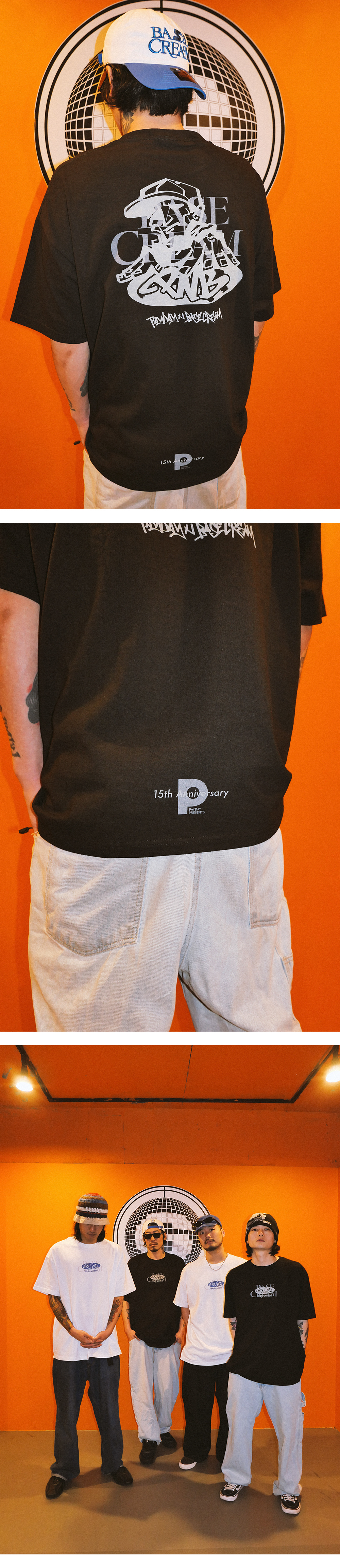 힙합이라는 문화를 필두로 , 댄서, 래퍼, 디제이등 다양한 포지션에 멤버들이 모여있는 팀 PAYDAY의 15주년 파티를 기념하기 위하여 제작한 베이스크림과의 협업제품입니다.