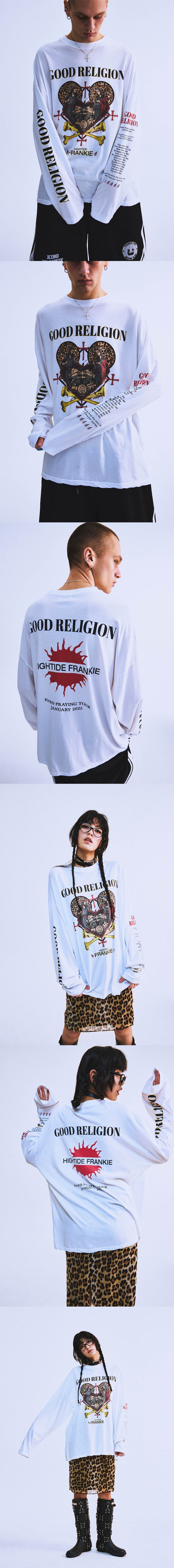 SIZE : FREE 어깨 67cm 가슴 65cm 소매 64cm 기장 75.5cm 사이즈 측정은 재는 방법과 위치에 따라 1~3cm 오차가 발생할수 있음 Coisheam : 183cm 63kg Munira : 177cm 61kg Bad Religion 을 패러디 한 Good Religion 롱 슬리브 입니다 Good Religion 이라는 가상의 밴드 투어 굿즈 제품으로 앞부분은 Good Religion의 그래픽 아트웍을 소매와 뒷부분엔 투어에 대한 가상 정보를 표현 하였습니다 바이오 워싱이 작업된 20수 원단으로 제작후 노멀 워싱을 한번더 진행하여 세탁후 줄어듬 현상을 최소화 하였습니다 -혼용률- 30수 면 100% / 바이오 워싱 -주의- 드라이 권장 옷을 뒤집어 미지근한 물에 세탁 표백제나 강력한 세제 사용 금지 건조기 사용 금지 프린트 부분 다림질 금지 Made in KOREA