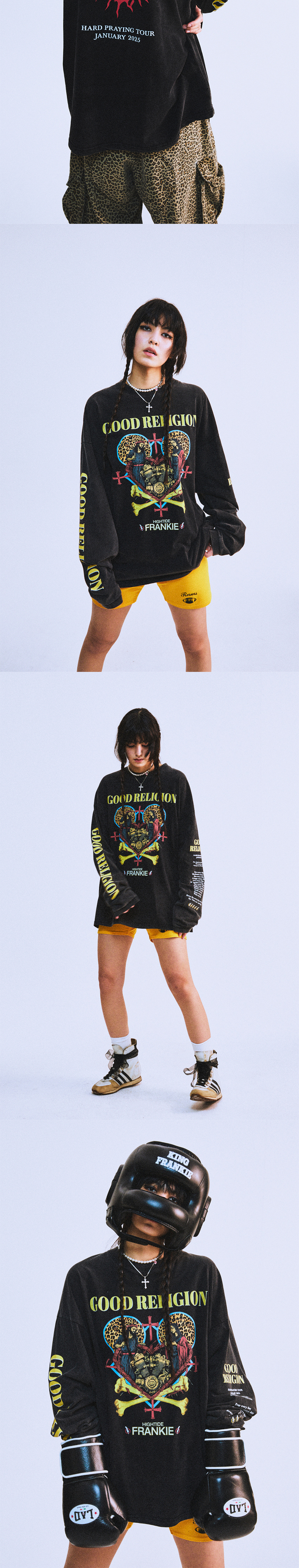 SIZE : FREE 어깨 67cm 가슴 65cm 소매 64cm 기장 75.5cm 재는 방법과 위치에 따라 1~3cm 오차 발생할수 있음 Coisheam : 183cm 63kg Munira : 177cm 61kg 앞부분 Good Religion 그래픽 아트웍 소매와 뒷부분엔 투어에 대한 가상 정보 표현 20수 원단 사용 -혼용률- 20수 면 100% / 썰파 워싱 -주의- 드라이 권장 옷을 뒤집어 미지근한 물에 세탁 표백제나 강력한 세제 사용 금지 건조기 사용 금지 프린트 부분 다림질 금지 -안내 사항- 썰파 염색과 솔트 워싱 의류에 자연스러운 마모 효과를 주어 고유의 빈티지한 연출 완성 핸드메이드로 작업 진행 완성된 효과가 개체 마다 색상, 워싱의 패턴이 전부 다름 짙은 주름과 썰파 흔적이 선으로 나타날수 있음 약간의 시큼한 냄새는 염료의 특성으로 한두 차례 세탁 후 냄새 사라짐 위의 사유로 교환, 환불은 불가 합니다 Made in KOREA