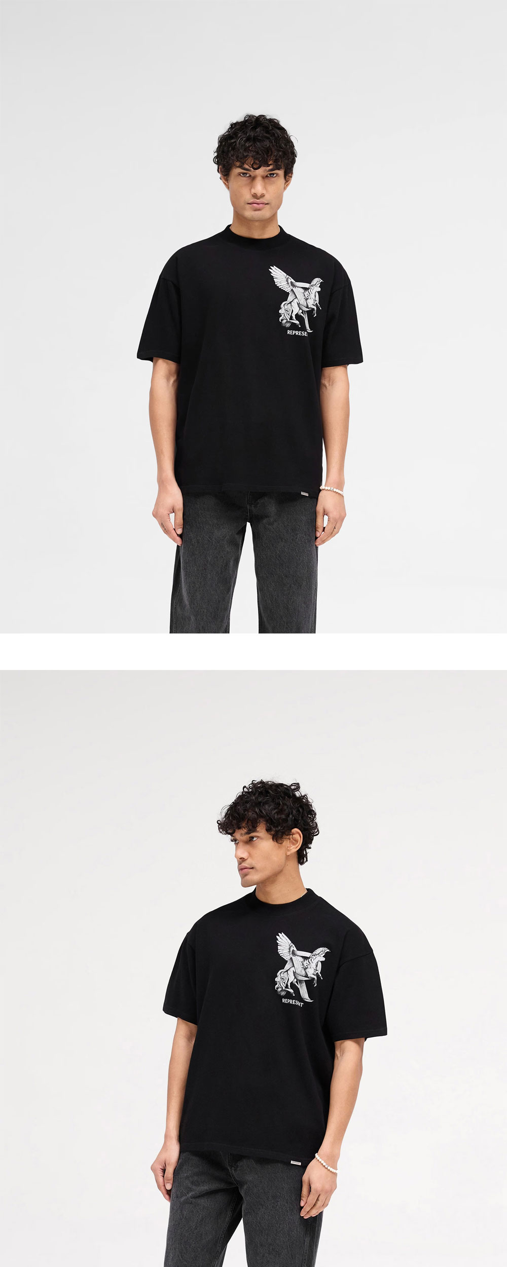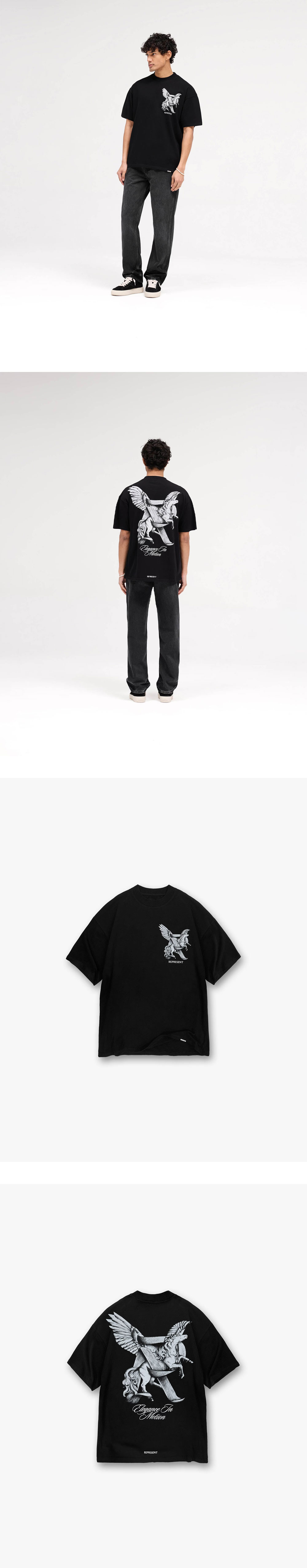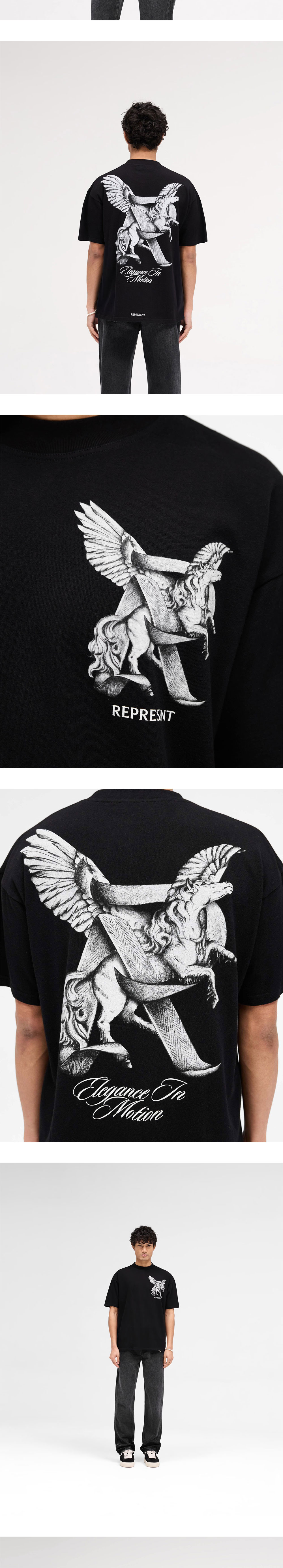 티셔츠의 앞면과 뒷면의 엘레강스 인 모션 그래픽이 매력적인 리프레젠트의 엘레강스 인 모션 티셔츠 제트 블랙입니다. - 제트 블랙 - 세미 오버 핏 - 금속 막대 로고 - 면 100% *모델: 188cm 75kg, M 착용