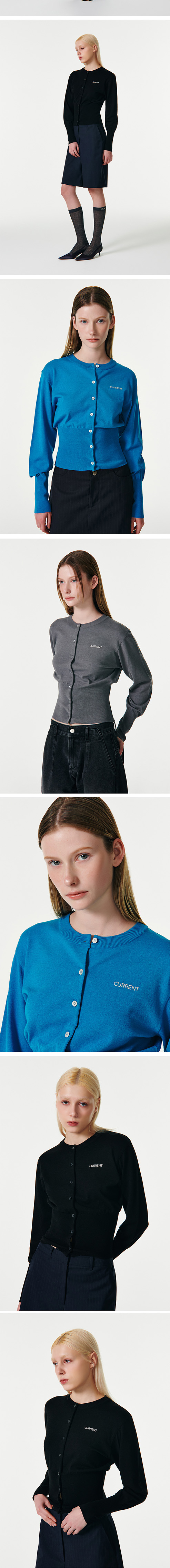 OUTSHELL - RAYON 66% POLYESTER 28% ACRYLIC 6% - 개발원사로 소프트한 터치감과 하이게이지의 FINE 한 표면감 - 클래식한 라운드넥 디자인에 커렌트 로고 자수 포인트 - 밑단 소매를 와이드한 리브 짜임으로 마감하여 안정적이면서 페미닌한 실루엣이 돋보입니다. - 버튼 업 스타일로 단품으로 착용 가능하며 버튼을 오픈하여 다양한 아이템과 레이어드하여 다양한 룩으로 연출 가능합니다. S 총장 51 어깨 43 가슴 44 화장 46.5 M 총장 52 어깨 44 가슴 46.5 화장 61
