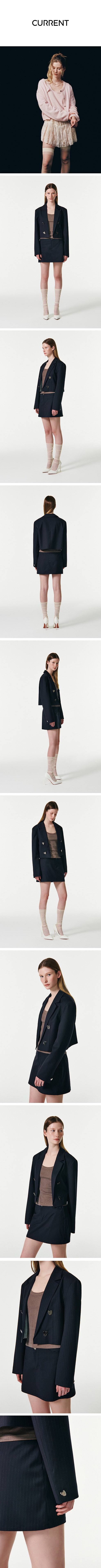 OUTSHELL - 겉감 : POLYASTER 69% RAYON 29% / 안감 : POLYASTER 100% - 페미닌한 느낌을 줄 수 있는 고급스러운 트위드 소재 사용 - 트렌디한 세미 크롭 기장의 세미오버핏으로 여유롭고 세련된 실루엣 - 하트 쉐입 단추를 활용한 페미닌한 디자인 - 배색 스트라이프 패턴의 안감을 활용한 높은 완성도의 디자인 - 어깨패드를 넣어 단단함이 잘 살 수 있는 실루엣 연출 S 총장 44 어깨 44 가슴 53.25 화장 62 M 총장 47 어깨 45.5 가슴 55.75 화장63