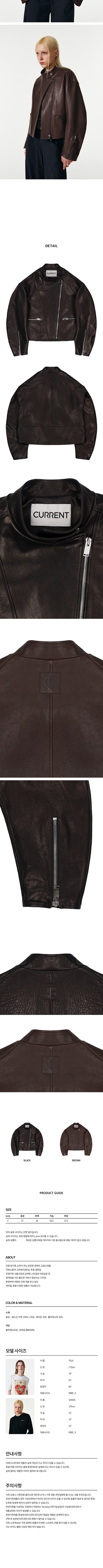 OUTSHELL - 겉감 LAMSKIN LEATHER 100% / 안감 RAYON 50% POLYASTER 50% - 리얼 양가죽 소재가 주는 은은한 광택의 고급스러움 - 자연스럽게 그라데이션되는 투톤 컬러감 - 트렌디한 크롭기장의 오버핏 스타일로 여유로운 핏 - 광택감을 가진 볼드한 지퍼가 돋보이는 디자인 - 후면부에 커렌트 자체 개발 로고 날인 - 캐주얼, 포멀 다양한 연출이 가능합니다. F 총장 57 어깨 56 가슴 59.5 소매길이 57.5