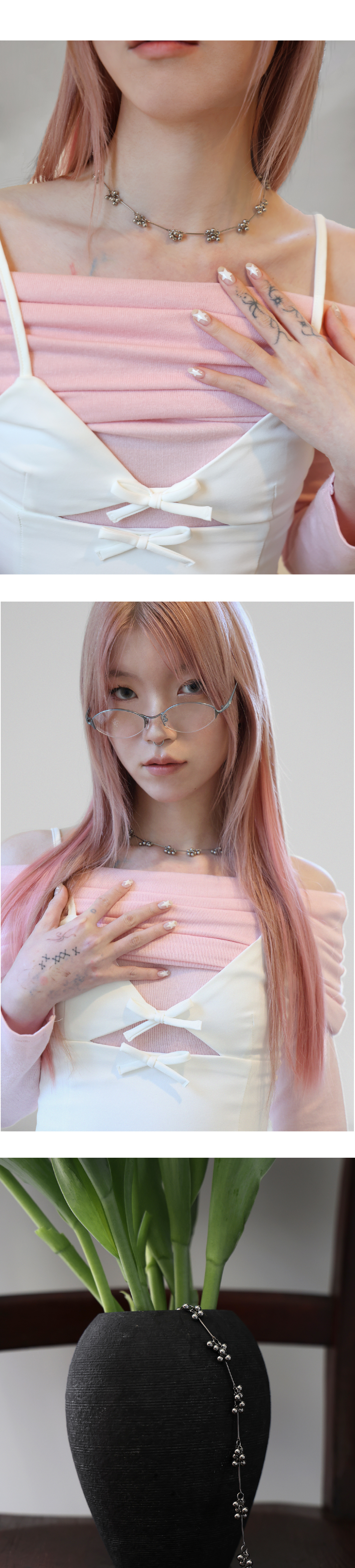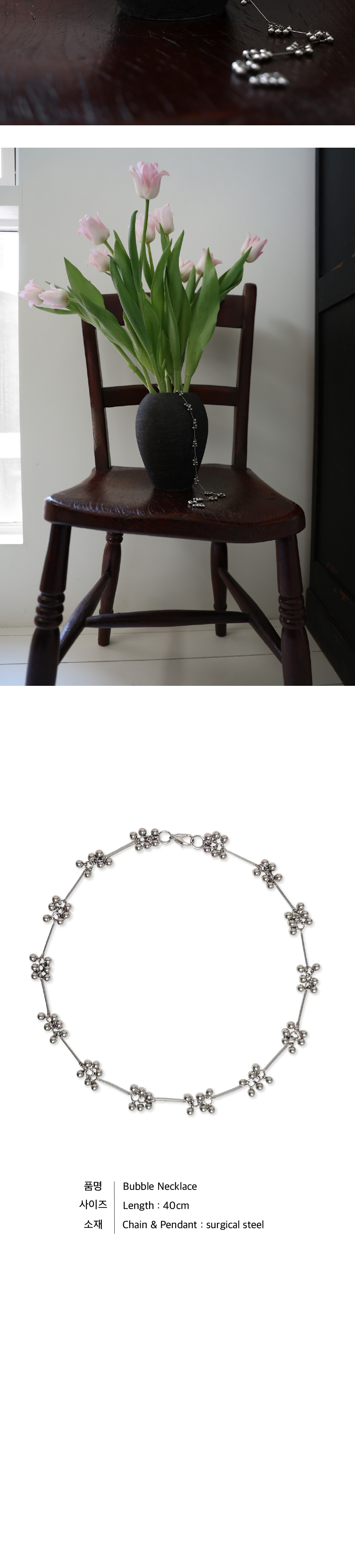 볼 팬던트들이 조화롭게 엮여 매력을 더하는 버블 네크리스(Bubble Necklace) 입니다. 마치 방울이 통통 튀는 듯한 볼 체인의 디자인이 경쾌하면서도 세련된 분위기를 연출해 줍니다. 일반적인 여성 기준으로 약간 여유 있는 초커 길이로, 목을 조이지 않아 답답함 없이 편안하게 착용할 수 있어 활동하기에도 좋습니다. 볼 팬던트의 입체적인 조형미와 선이 어우러져 감각적인 아름다움을 선사하며, 데일리 룩에 포인트를 더하기에 완벽한 아이템입니다. 체인과 팬던트는 써지컬 소재로, 강한 내구성, 알러지 없음, 고급스러운 질감과 고유의 광택이 처음과 같이 오래도록 유지되는 것이 써지컬 소재의 장점입니다. Chain : surgical steel Pendant : surgical steel