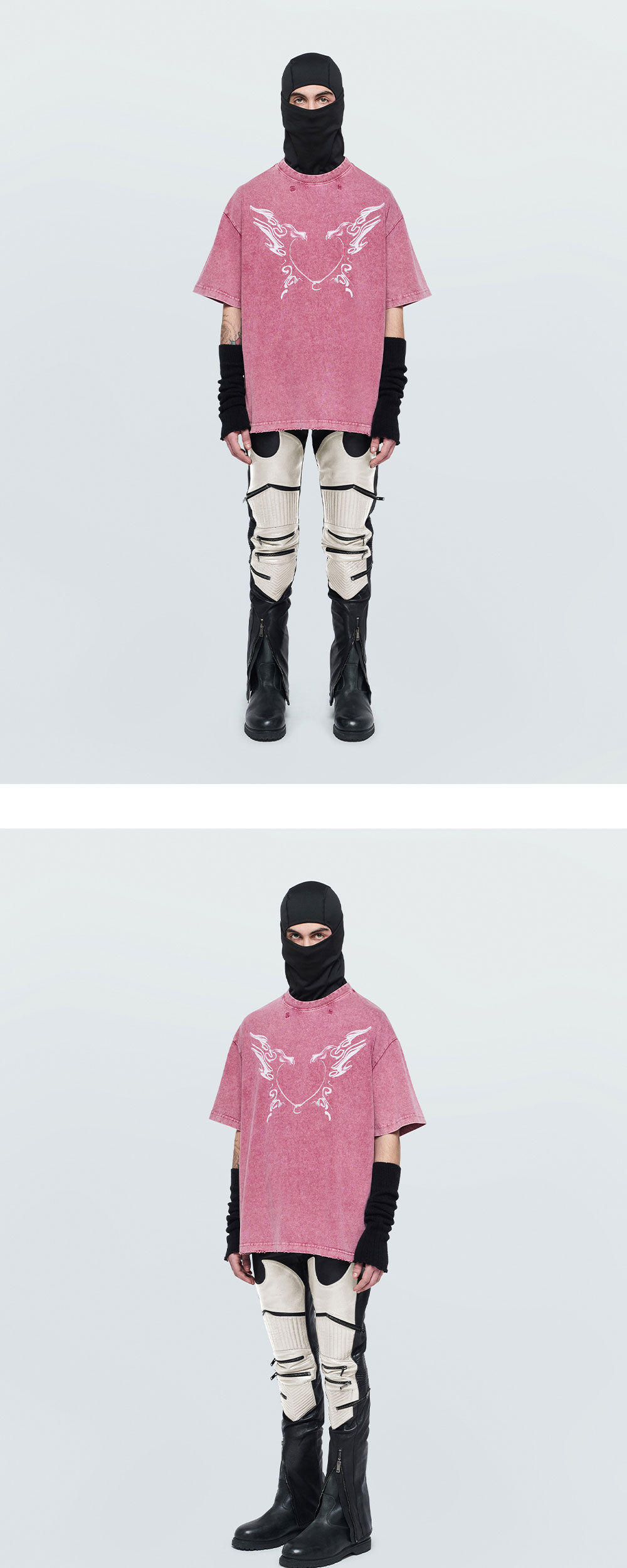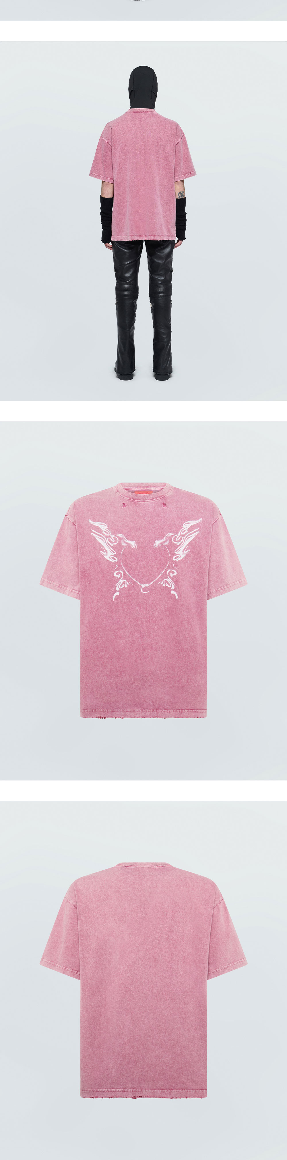 앞면에 그려진 그래픽이 포인트인 쿠시코크의 하트 티셔츠 레드입니다. - 물빠진 색감 - 빈티지 무드 - 하트와 날개를 연상 시키는 그래픽 - 여유로운 핏