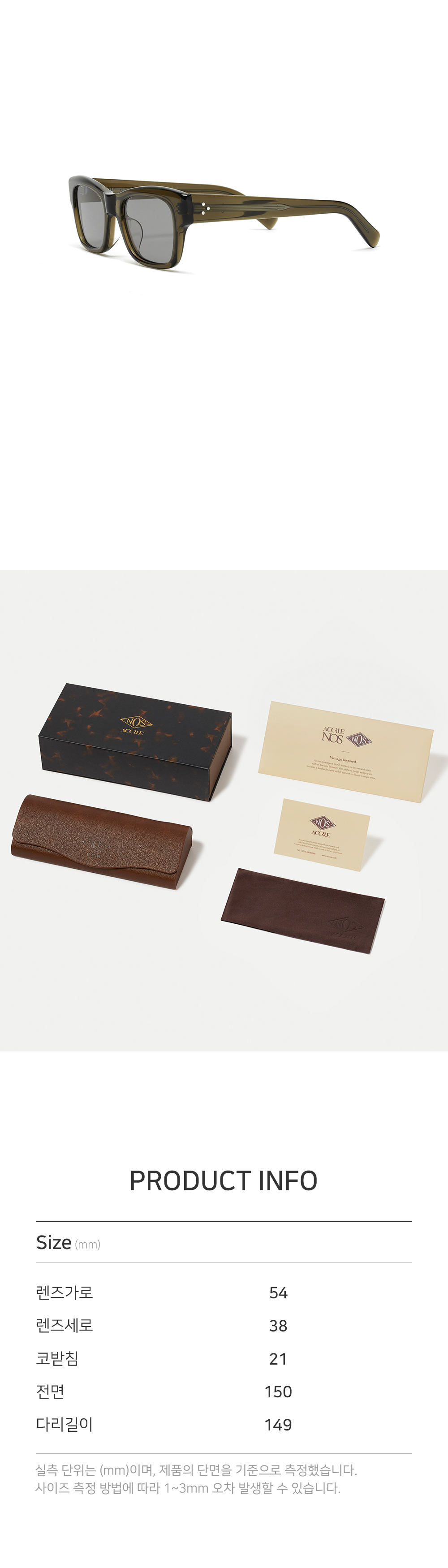 ACCRUE NOS(New old stock)는 “Vintage Inspired.” 캐치프레이즈 아래, 오랜 시간 동안 잠들어있던 과거의 오리지널리티를 그대로 재현하고, 그 속에서 새로운 가치를 창조하는 것을 목표로 합니다. NOS-13은 1900년대 중반 프렌치 웰링턴 선글라스를 베이스로 디자인되었습니다. 아메리칸 웰링턴에 비해 더욱 과감한 라인과 상단 경사각, 둥근 모서리 마감이 특징입니다.