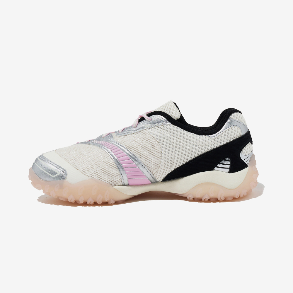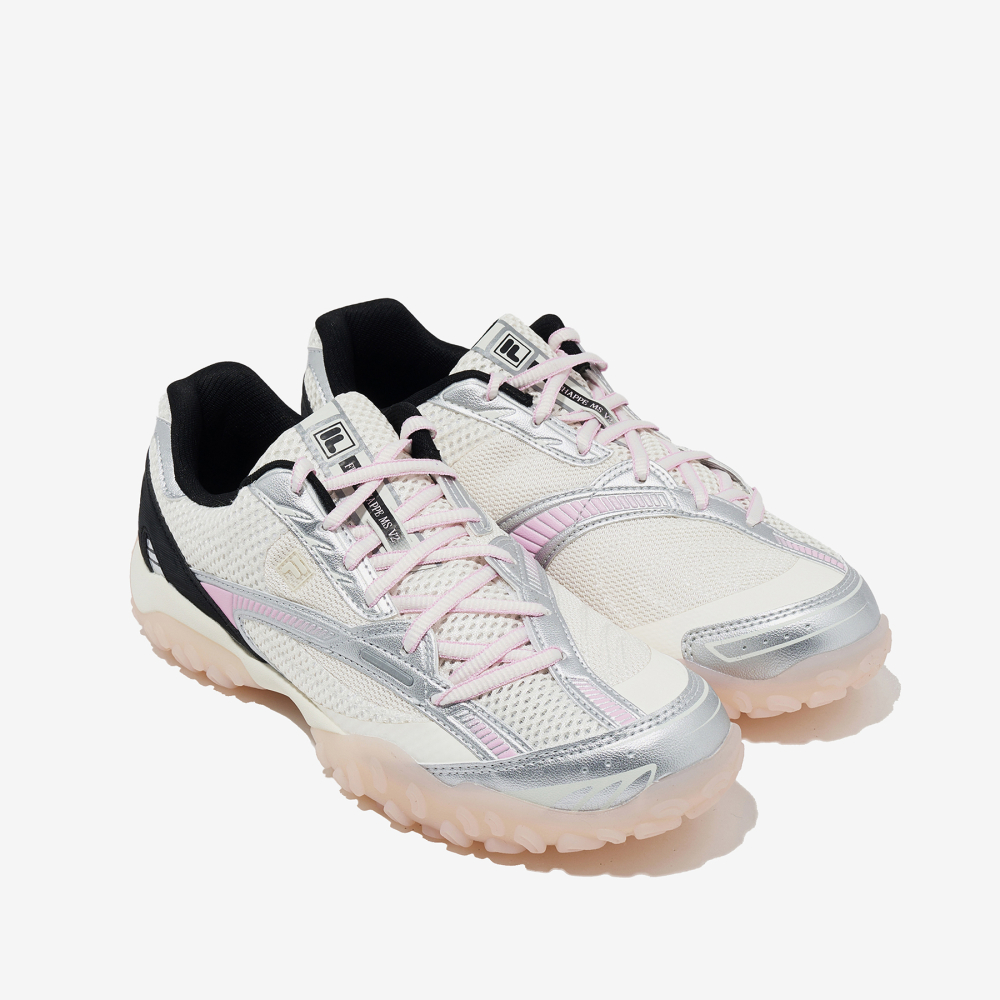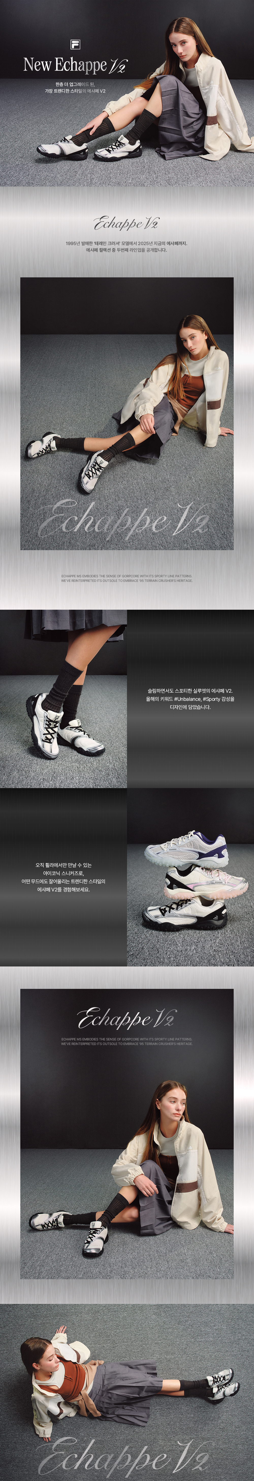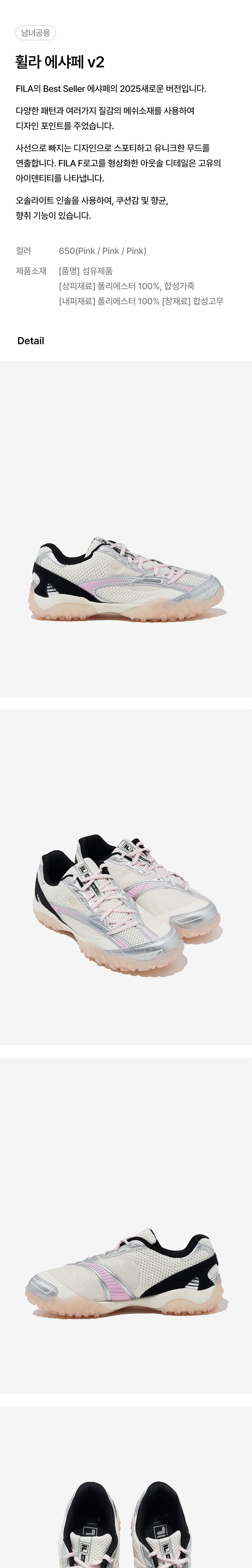 FILA의 Best Seller 에샤페의 2025새로운 버전입니다.다양한 패턴과 여러가지 질감의 메쉬소재를 사용하여 디자인 포인트를 주었습니다.사선으로 빠지는 디자인으로 스포티하고 유니크한 무드를 연출합니다. FILA F로고를 형상화한 아웃솔 디테일은 고유의 아이덴티티를 나타냅니다.오솔라이트 인솔을 사용하여, 쿠션감 및 향균, 향취 기능이 있습니다.