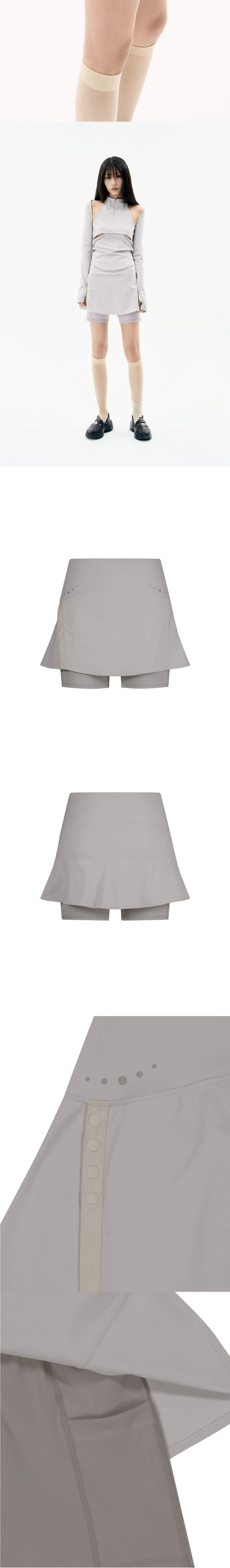 이너 쇼츠가 내장 된 스포츠 미니 스커트 | 미니기장감의 타이트 핏 | 4way 스트레치 레깅스 소재 사용으로 편안한 착용감 | UV차단 및 흡한속건의 creora® 소재사용 | 트임 디테일로 액티브한 활동성 제공 | 스냅 버튼을 통해 원하는 트임 양 조절 가능 | 쇼츠 기장감으로 페미닌한 실루엣 제공과 더불어 [Button Slit Leg Warmer] 와 조화로운 스타일링 가능 | 간단한 수납이 가능한 이너쇼츠 사이드 포켓 | 허리 양 사이드 그래픽 필름 디테일 * 동시즌 [Button Slit Leg Warmer]와 셋업 아이템 * Model is 168cm and wears size 1.