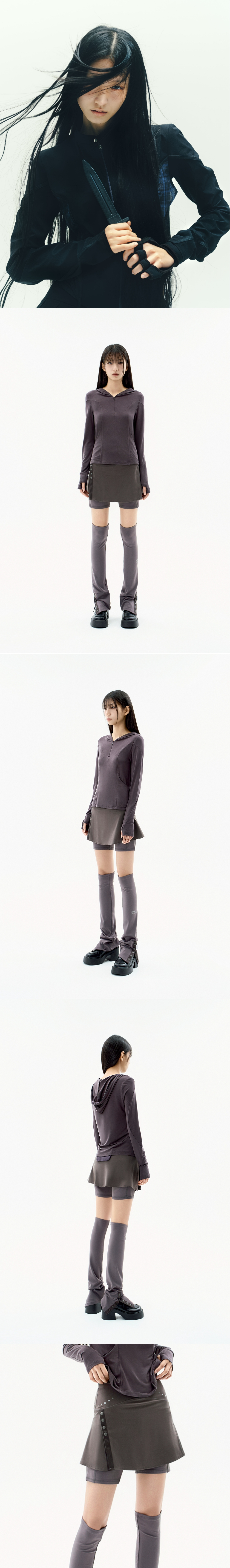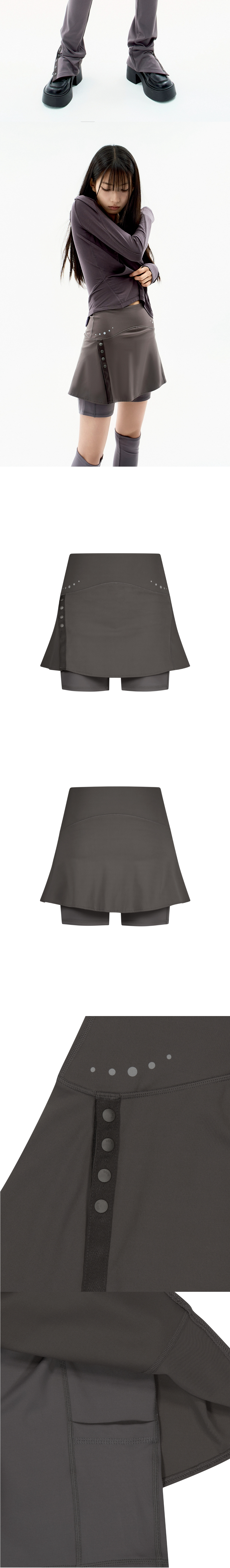 이너 쇼츠가 내장 된 스포츠 미니 스커트 | 미니기장감의 타이트 핏 | 4way 스트레치 레깅스 소재 사용으로 편안한 착용감 | UV차단 및 흡한속건의 creora® 소재사용 | 트임 디테일로 액티브한 활동성 제공 | 스냅 버튼을 통해 원하는 트임 양 조절 가능 | 쇼츠 기장감으로 페미닌한 실루엣 제공과 더불어 [Button Slit Leg Warmer] 와 조화로운 스타일링 가능 | 간단한 수납이 가능한 이너쇼츠 사이드 포켓 | 허리 양 사이드 그래픽 필름 디테일 * 동시즌 [Button Slit Leg Warmer]와 셋업 아이템 Model is 168cm and wears size 1.