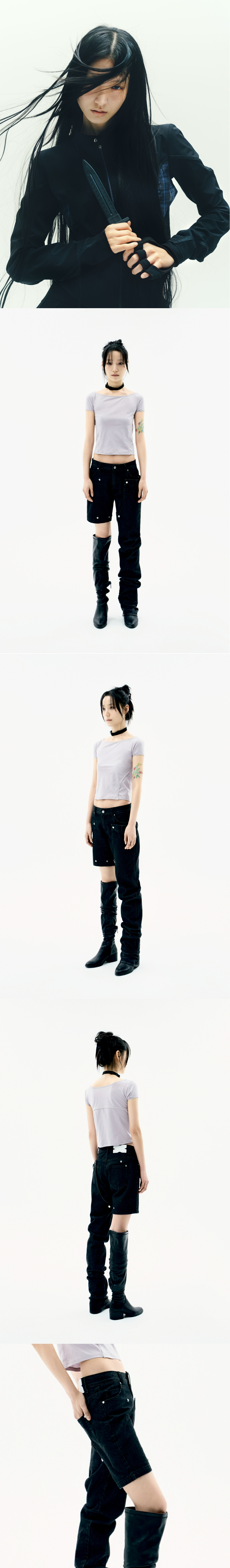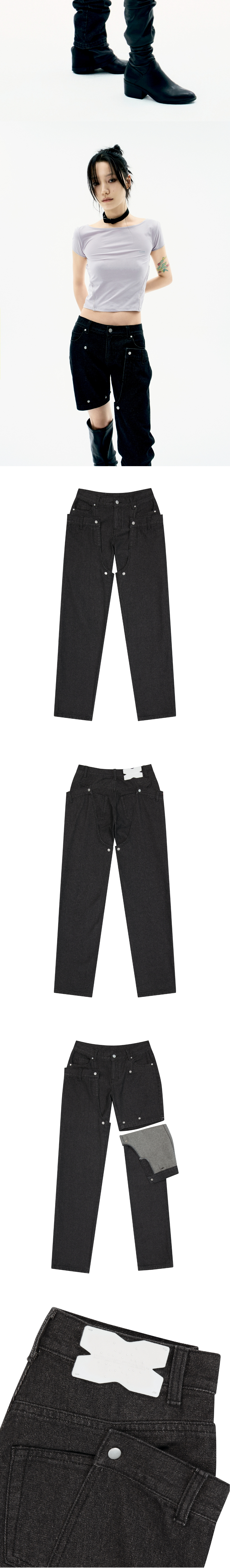 스냅으로 탈,부착하여 다양한 스타일링이 가능한 데님팬츠 | 슬림핏 | OJOS 각인 버튼 사용 | 스냅을 활용하여 4부 기장의 팬츠, 워머로 스타일링 가능 | 후면 패치 포켓 | 후면 OJOS 가죽라벨 디테일 Model is 168cm and wears size 2.