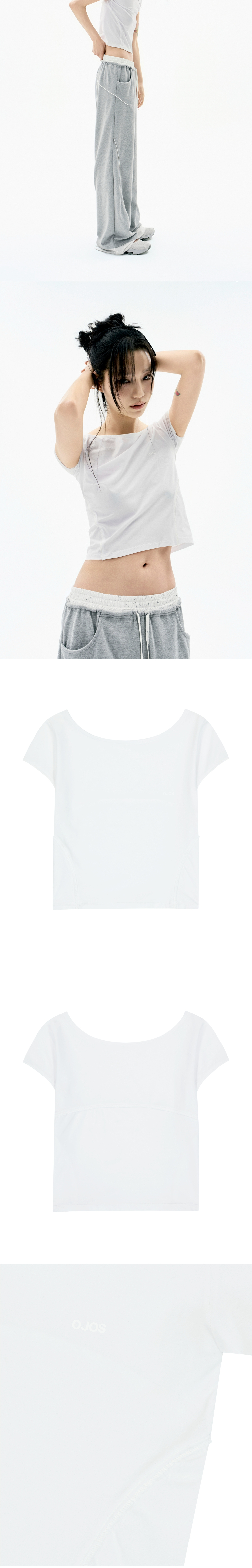 레이스 트리밍이 있는 티셔츠 | 크롭핏 | 지속적인 신축성, 흡습속건성에 탁월한 SORONA® - AGILE 원단 사용 | 파팅라인으로 이어지는 레이스 트리밍 | 전면 OJOS 로고 전사 Model is 168cm and wears size 1.