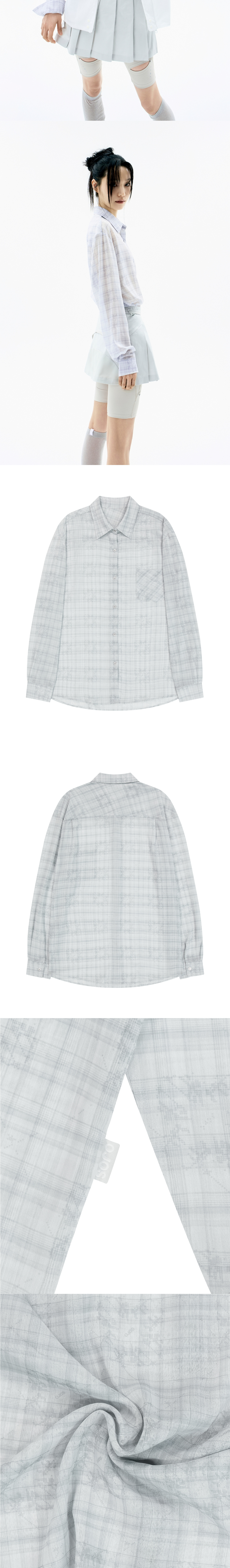OJOS 체크 패턴을 사용한 쉬어 셔츠 | 오버 핏 | 뒷면 중앙 핀턱 디테일로 활동성 우수 | 전면 가슴 포켓 | 투명한 쉬어 소재로 한 여름에도 쾌적한 착용감 | 측면 오호스 폴딩 라벨 디테일 Model is 168cm and wears size OS.