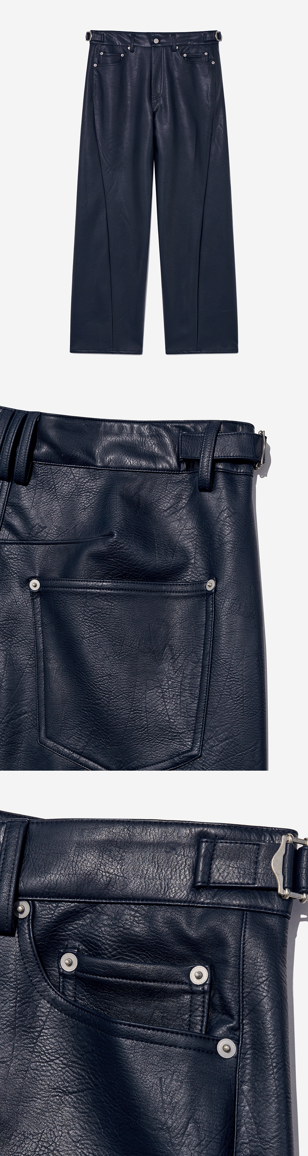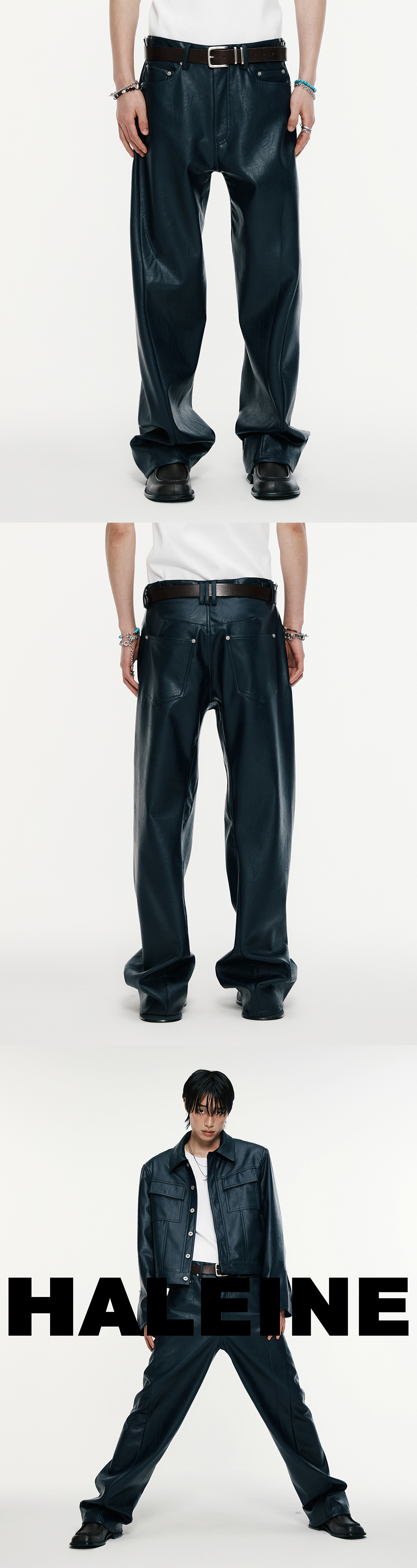 입체적인 트위스트 형태의 심라인으로 제작된 스트레이트 팬츠입니다. 은은한 광택감과 자연스러운 질감이 매력적인 페이크 레더를 사용하여 고급스러운 무드를 보여줍니다. 레귤러한 실루엣의 스트레이트 팬츠로 편하면서도 스타일리시한 연출이 가능한 제품입니다. -DETAIL- 레귤러 핏 입체적인 트위스트 심라인 허리 양 사이드 조절이 가능한 벨티드 디테일 리벳 디테일 -model-_x000B_ 187cm / 가슴둘레 91cm / 허리둘레 69cm / 엉덩이둘레 87cm - 2사이즈 착용_x000B_ * 모델의 경우 총장이 5cm 더 길게 제작된 제품을 착용 *
