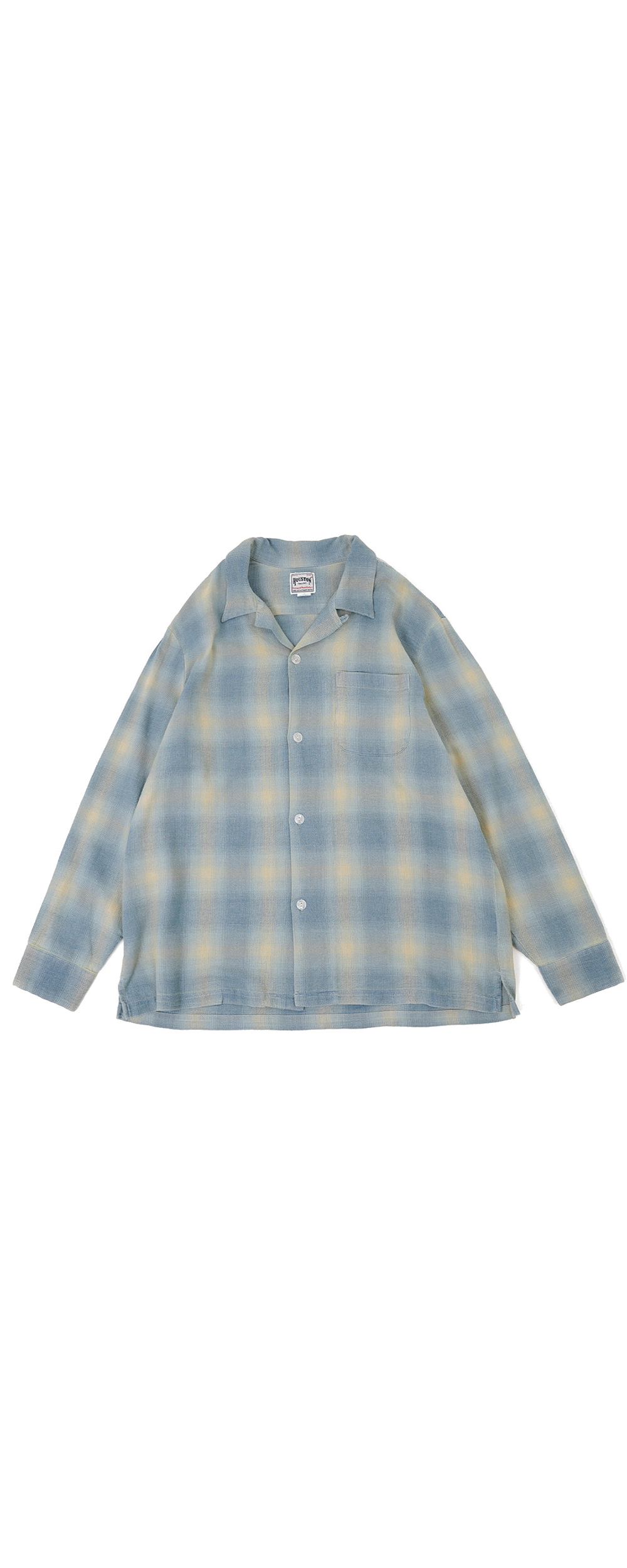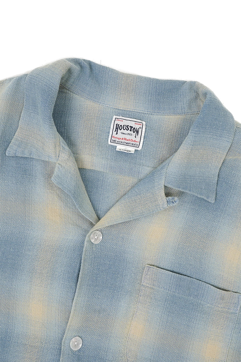 Houston Japan 41164 Indigo HB Ombre Check L/S Shirt - Indigo Vintage Wash 인디고 헤링본 능직으로 제작된 옴브레 긴팔 셔츠입니다. 인디고 헤링본 특유의 내구성이 뛰어나고 부드러운 소재감과 그라데이션으로 떨어지는 매력적인 컬러가 특징입니다. 오픈 카라 형태로 목 부분의 버튼을 사용하여 개폐가 가능합니다. 프론트 왼측에 포켓이 배치되어 있어서, 선글라스 등 소지품의 수납에 용이 가능합니다. * Cotton 100% * 빛에 의한 제품의 색감 차이가 존재 할 수 있습니다. * Made in China