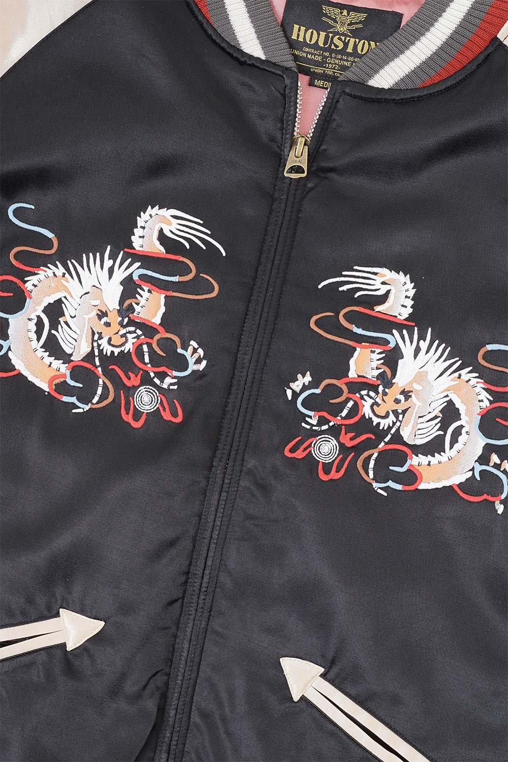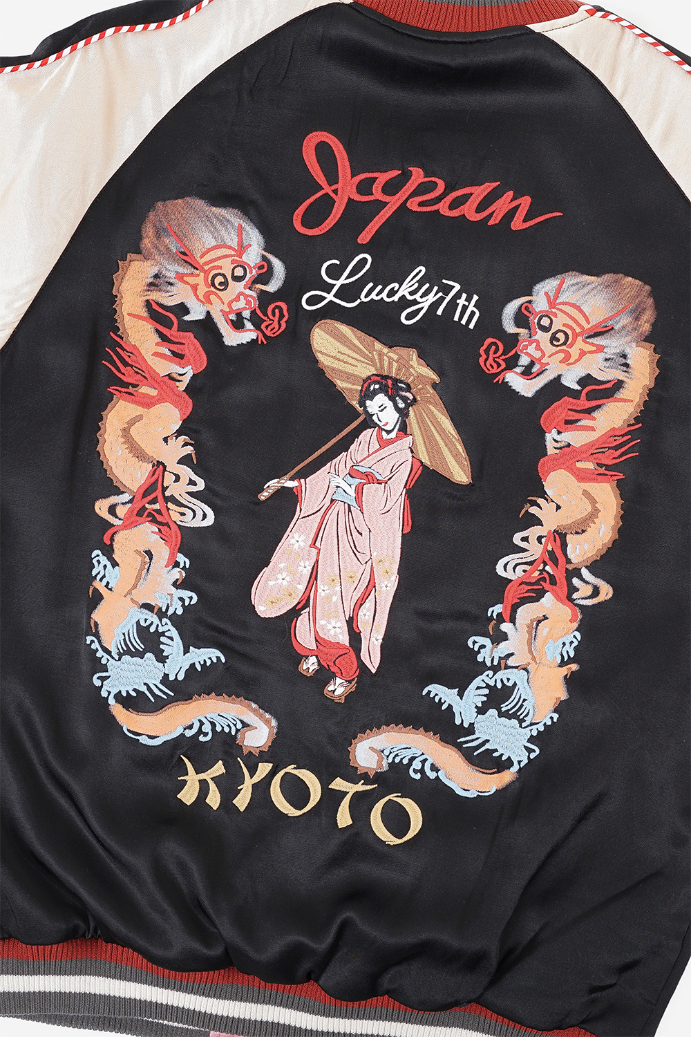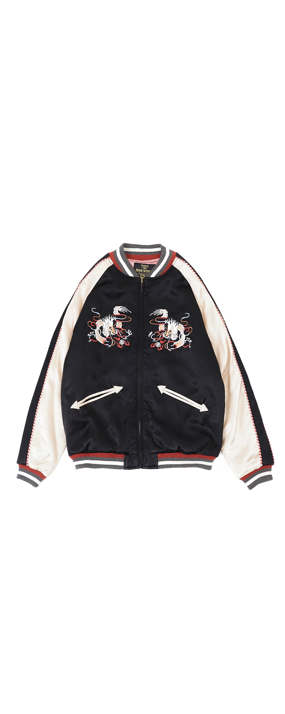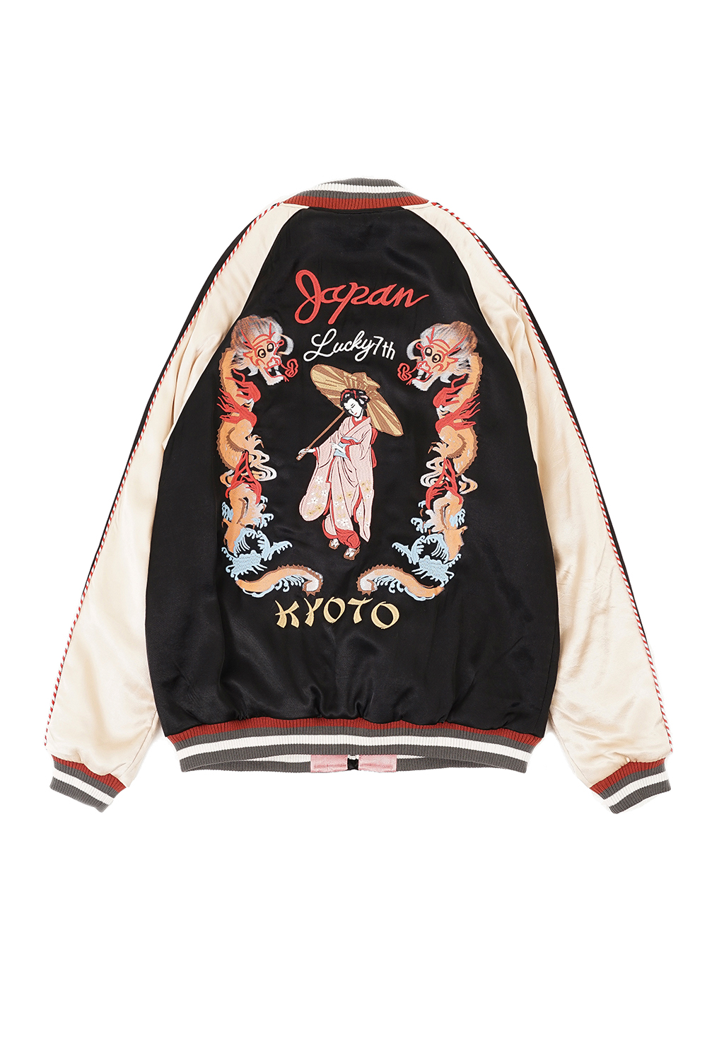 Houston Japan 51469 Rayon Souvenir Jacket (Maiko) - Black 수베니어 자켓입니다. 안감과 겉감 모두 레이온 세틴으로 제작되어 특유의 부드러운 감촉과 광택감이 특징입니다. 전통적인 자수가 특징인 아이템으로, 프론트의 양측으로 용의 자수가 후면부에는 큼지막한 사이즈의 일본의 마이코 자수가 디자인 되어 있습니다. 카라와 소매, 밑단의 배색감이 포인트입니다. 착용시 XL 사이즈가 일반적인 100 사이즈, XXL 사이즈가 105 사이즈 정도입니다. * Shell : Rayon 100% * Liner : Rayon 100% * Rib : Acrylic 100% * Filling : Polyester 100% * 빛에 의한 제품의 색감 차이가 존재 할 수 있습니다. * Made in China