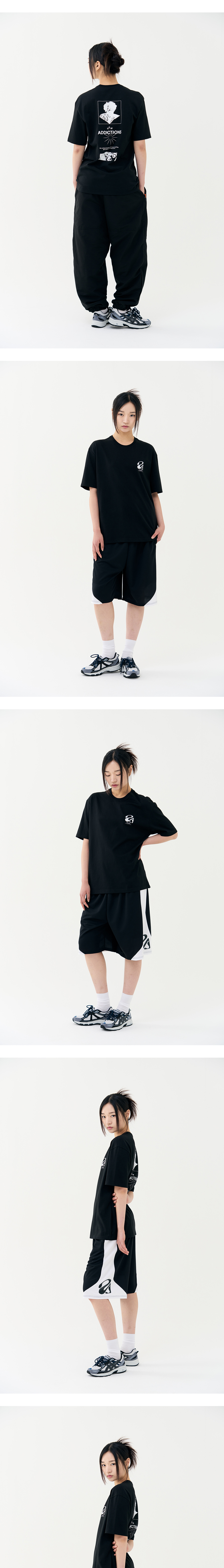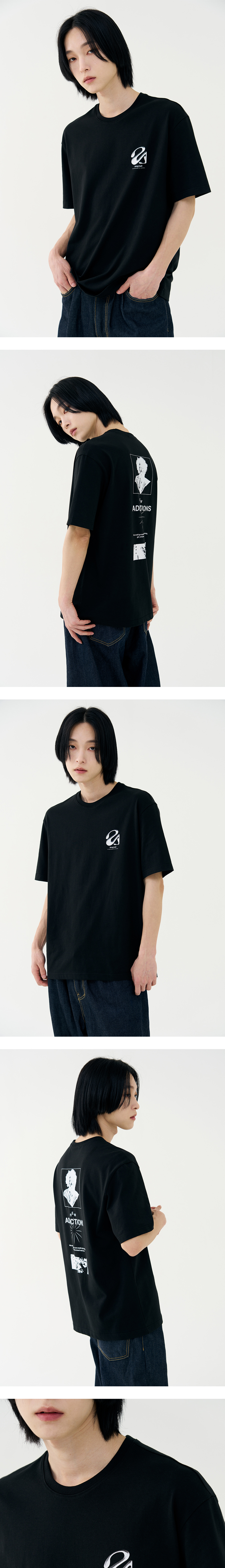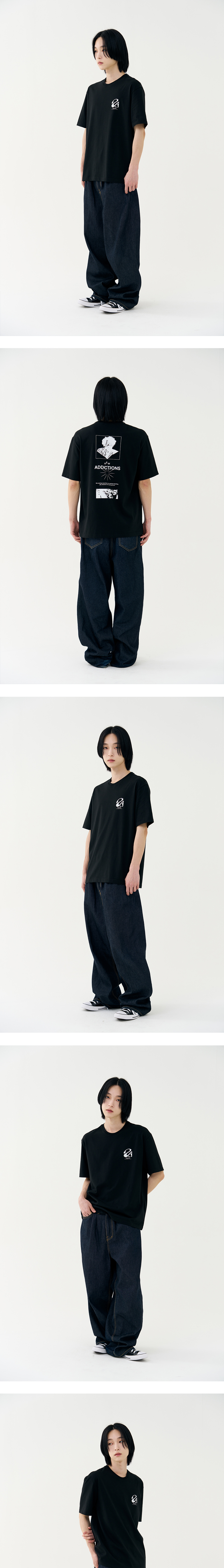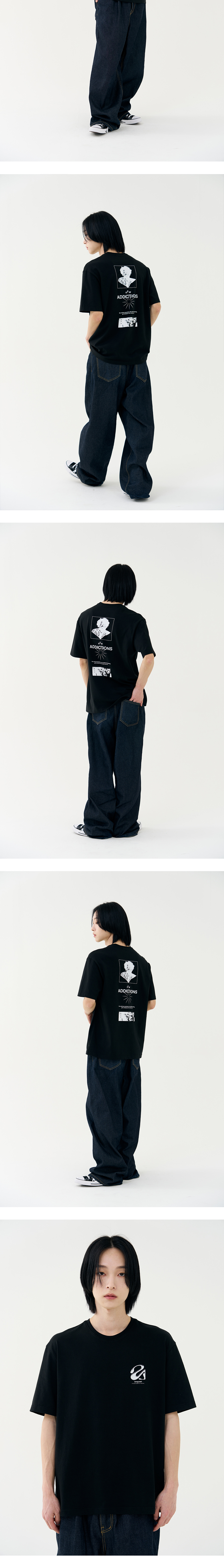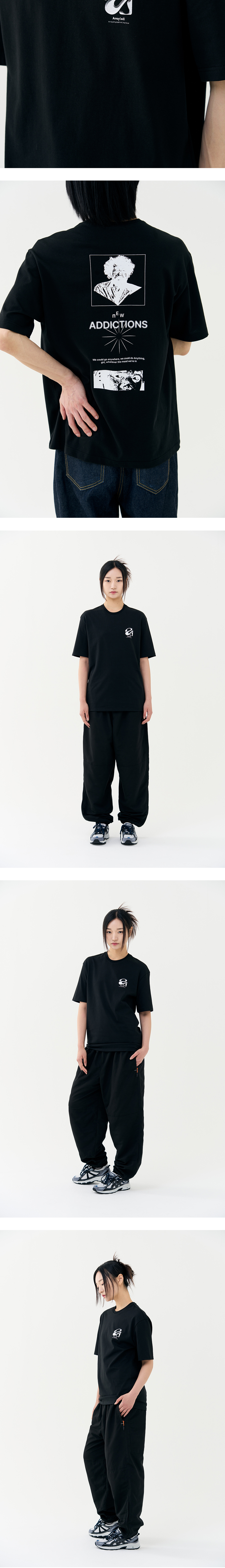 중독이라는 단어에 영감을 받아 디자인 계발, 부드러운 터치의 고급스러운 싱글지 원단을 사용하여 핏, 소재, 착용감에 초점을 맞춘 제품으로 잦은 세탁에도 변형 없이 오랜 기간 활용하실 수 있습니다. · 체형보정을 위한 섬세한 패턴 작업 · 적절히 여유 있는 세미 오버핏 실루엣 · 이너와 단품에 최적화된 라운드넥 디자인 · A.G.I 기획상품으로 나온 트렌디한 프린팅 아트웍