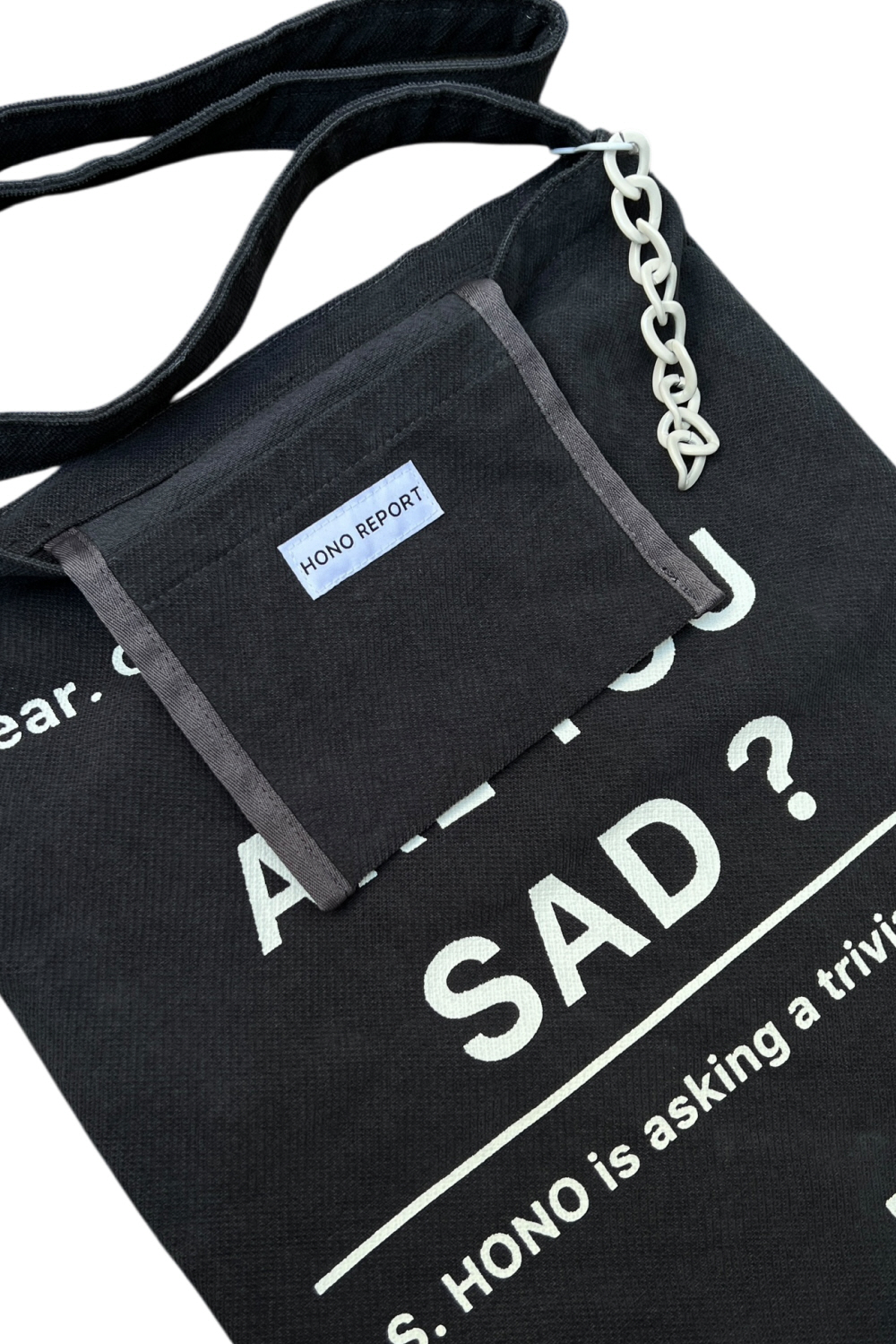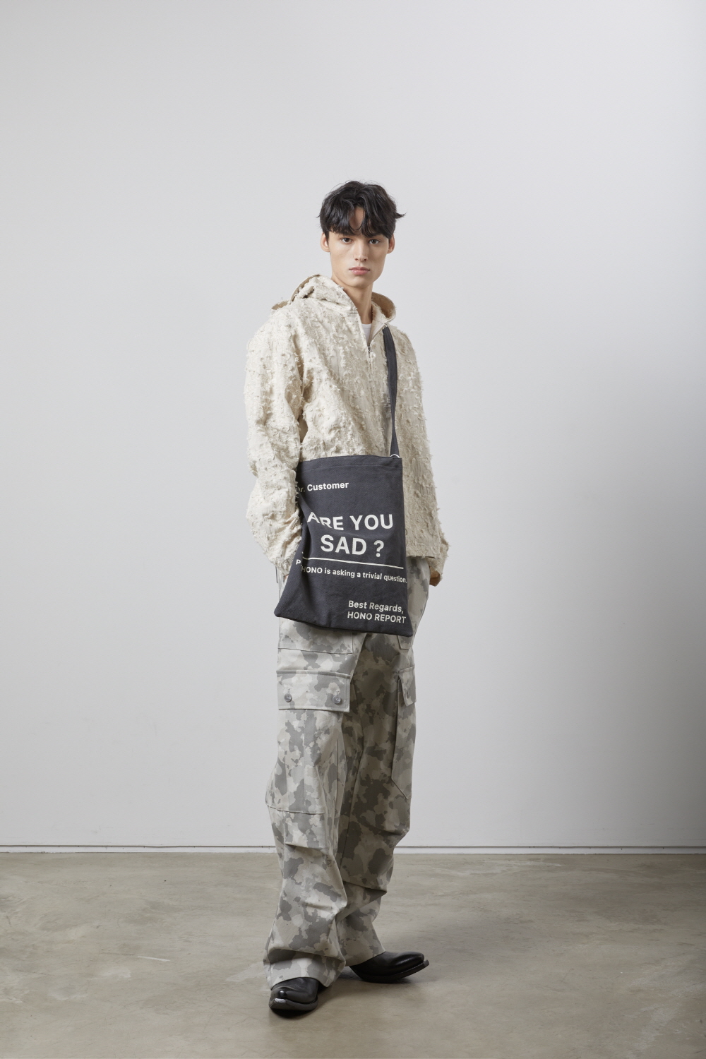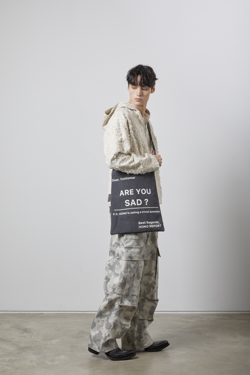 [Product Info] - 빈티지 가공된 원단 위에 거친 나염 - 탈부착 가능한 체인 키링 - 내부 작은 포켓 [Material] - 코튼 100% [Size] 가로 34.5 / 세로 40.5 / 끈 길이 103 cm [Model] 185 cm 60 kg