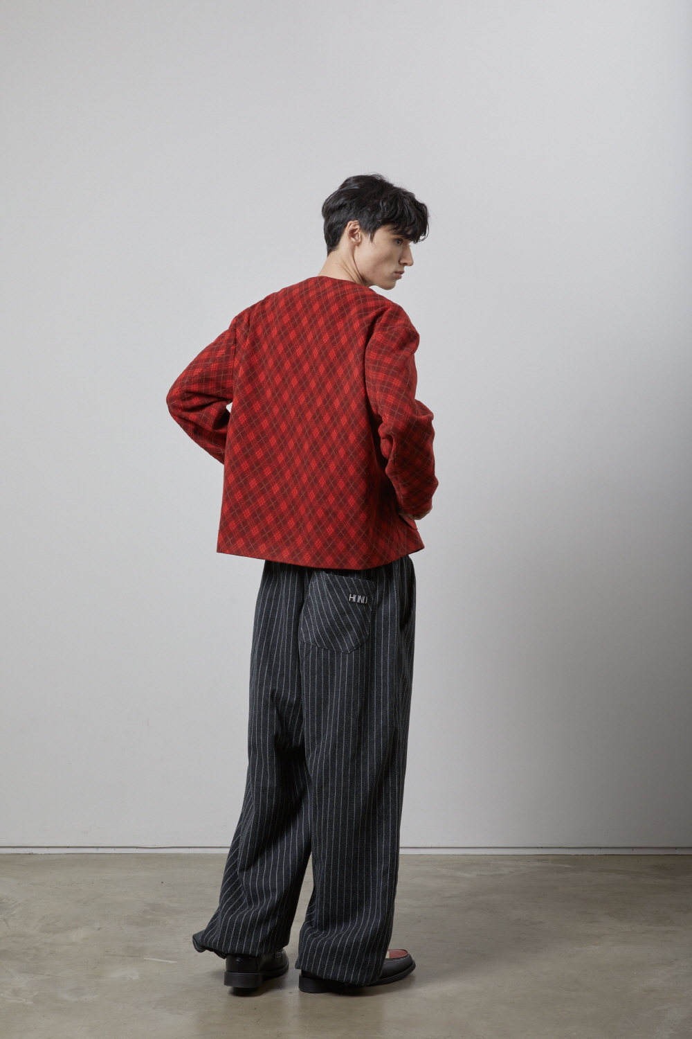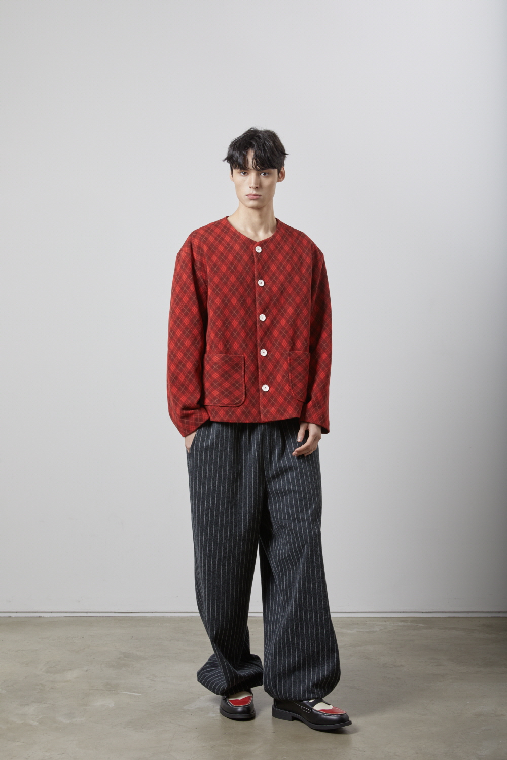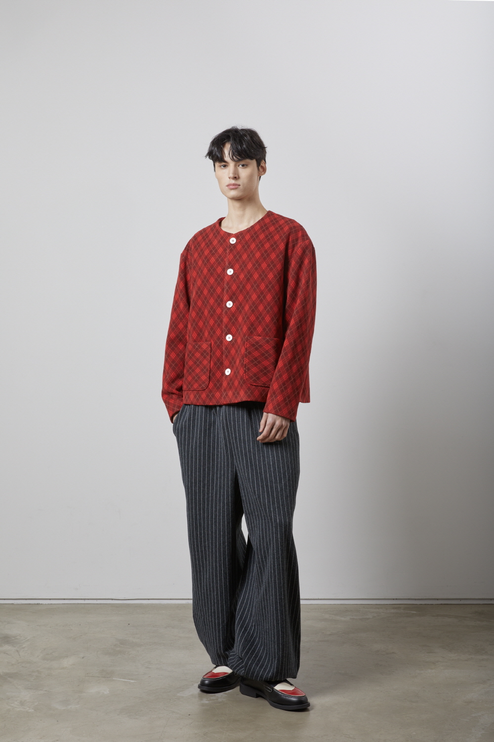 [Product Info] - 레드 아가일 패턴의 원단 - 카라가 없는 넥 라인 - 왼쪽 안주머니 [Material] - 폴리 80% 레이온 20% [Size] 총장 68 / 어깨 54 / 가슴 60 / 소매 59 cm [Model] 185 cm 60 kg
