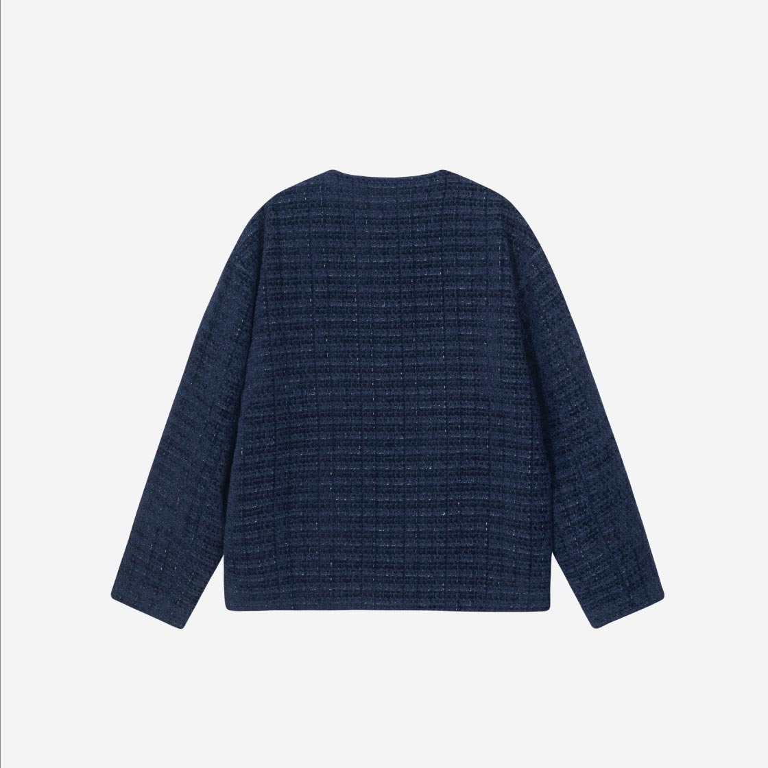 [Product Info] - 네이비 색상의 트위드 원단 - 카라가 없는 넥 라인 - 왼쪽 안주머니 [Material] - 폴리 100% [Washing Tip] - 드라이클리닝 / 건조기 사용 X [Size] One Size - 총장 68 / 어깨 54 / 가슴 60 / 소매 59 cm [Model] 184cm 65kg