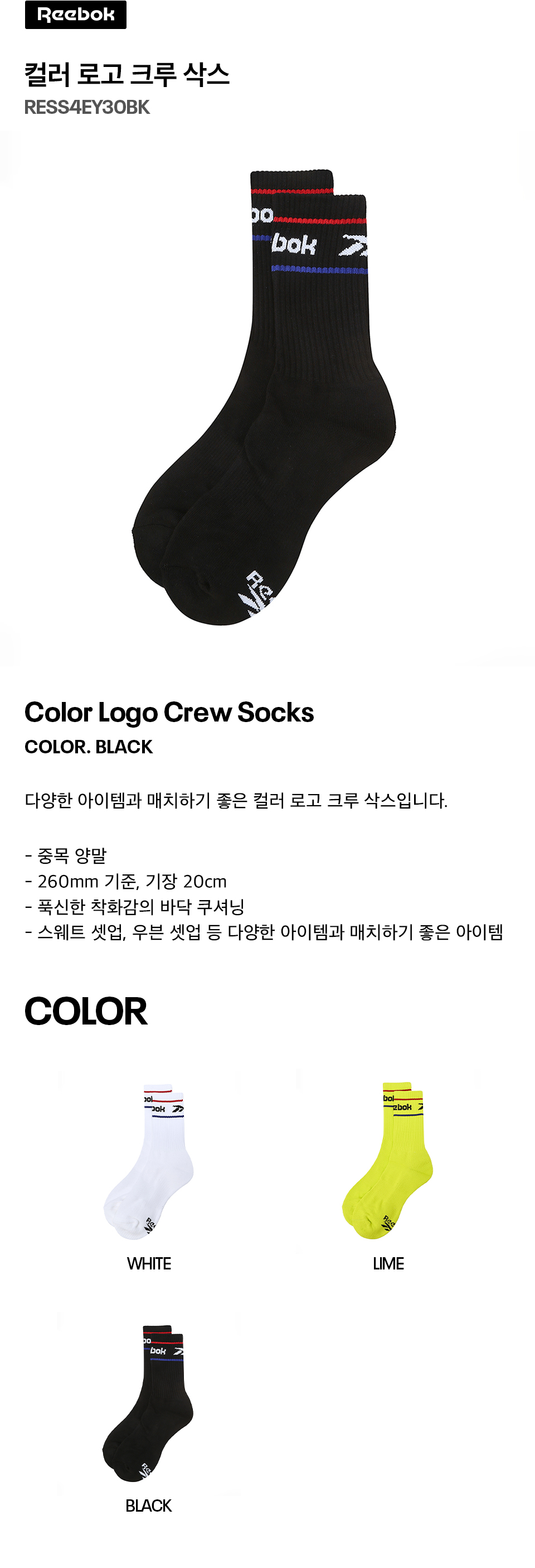 리복 컬러 로고 크루 삭스 블랙