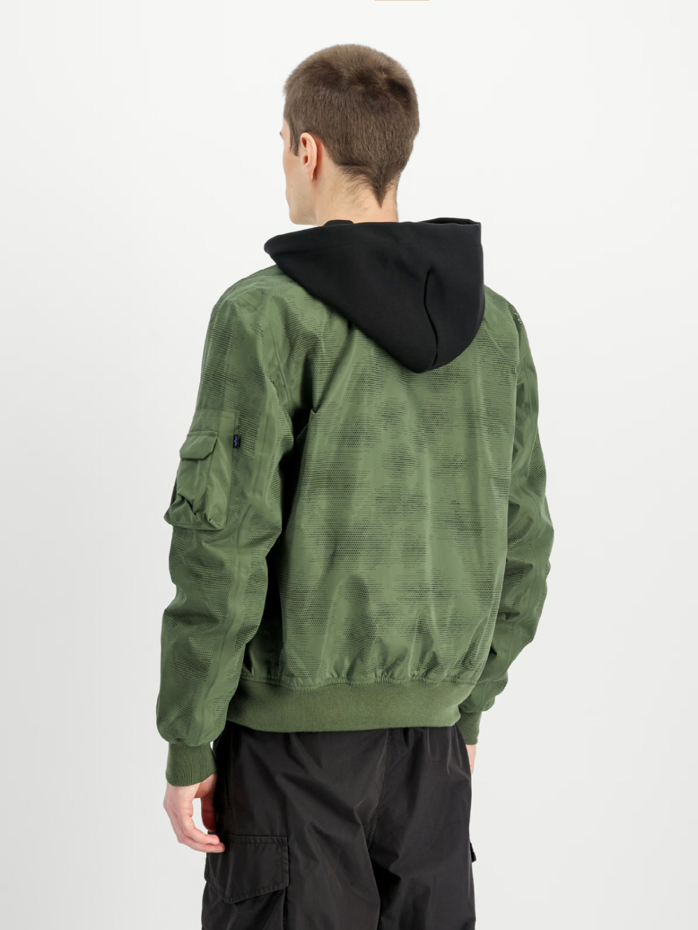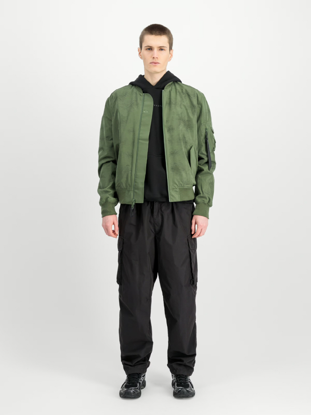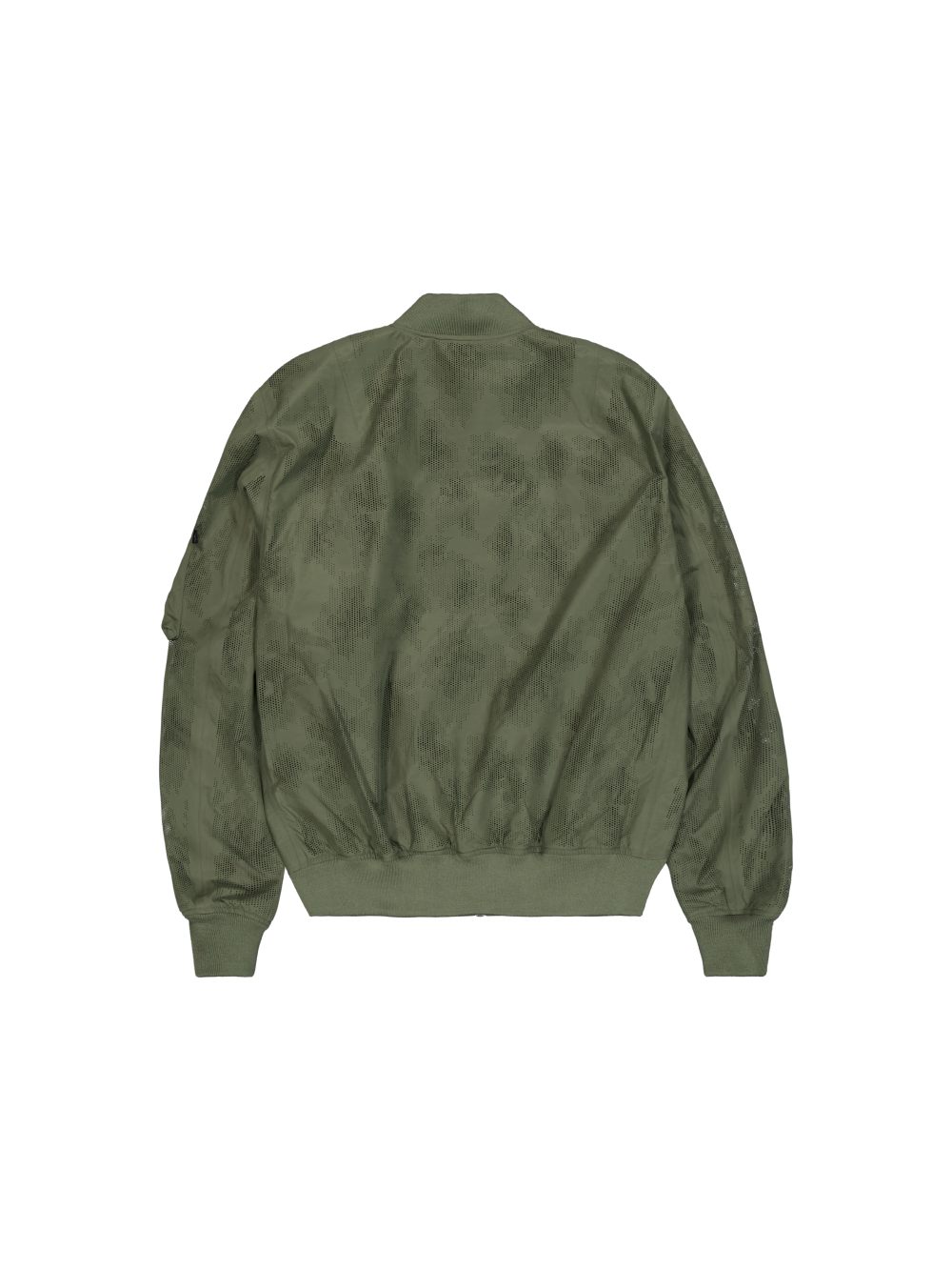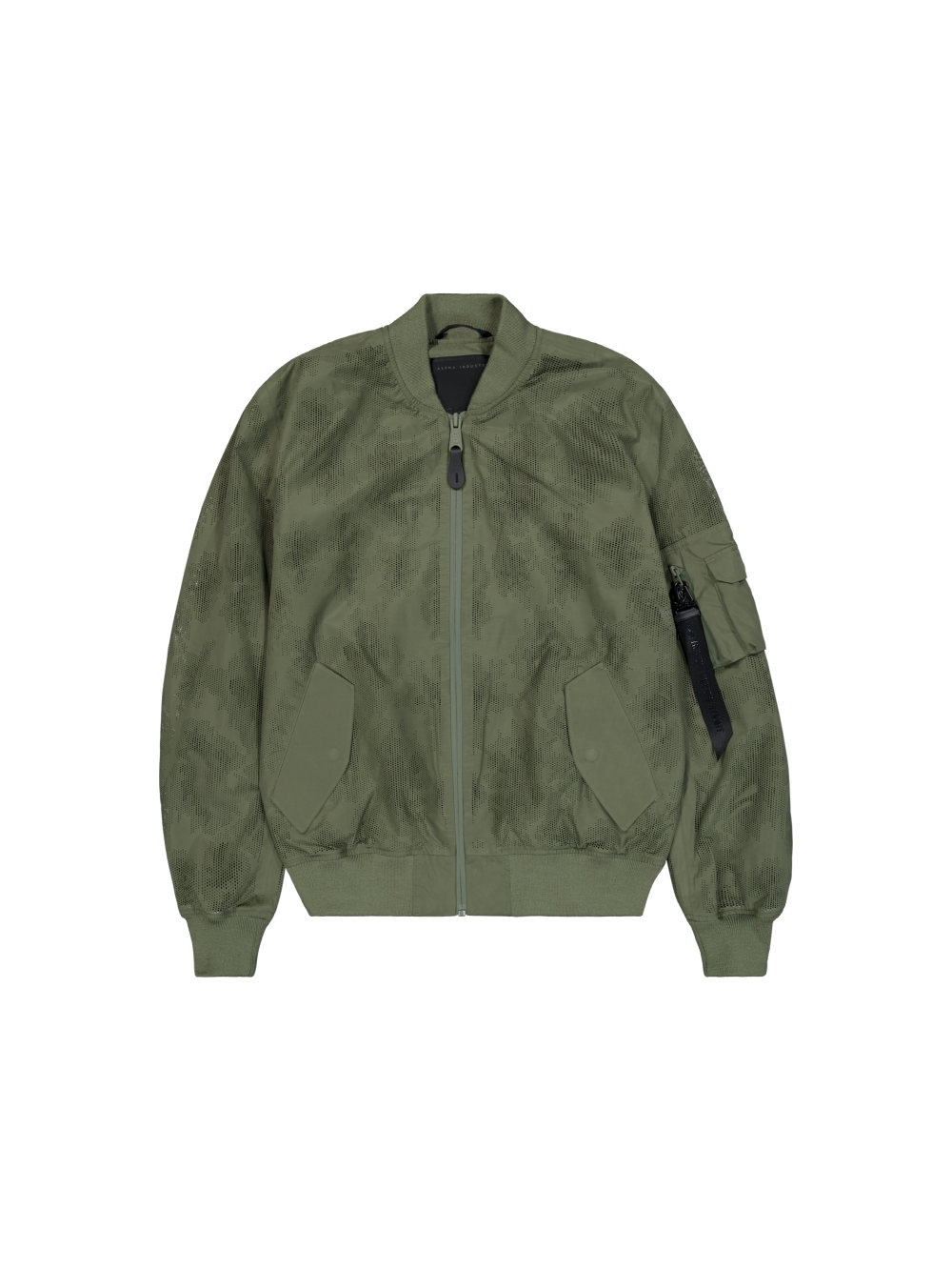 -헤비 플라이트 나일론(Heavy Flight Nylon) 원단 사용 -겉감에 레이저 펀칭(Perforation)으로 카모플라주 패턴 적용 -넥라인, 소매, 밑단에 립 니트(Rib Knit) 마감 -유틸리티 포켓 및 카라비너가 달린 "REMOVE BEFORE FLIGHT" 태그 포함 -플래킷(지퍼 덮개)에 ALPHA 로고 자수 -앞 지퍼 부분에 지그재그(Zig-Zag) 스티치가 들어간 플래킷 디자인 -가슴 부분에 나일론 웨빙으로 된 산소 탭(Oxygen Tab) 디테일 추가 -프런트 포켓 2개 (마그네틱 스냅 버튼 적용) -내부 웰트 포켓 1개 -루즈 핏