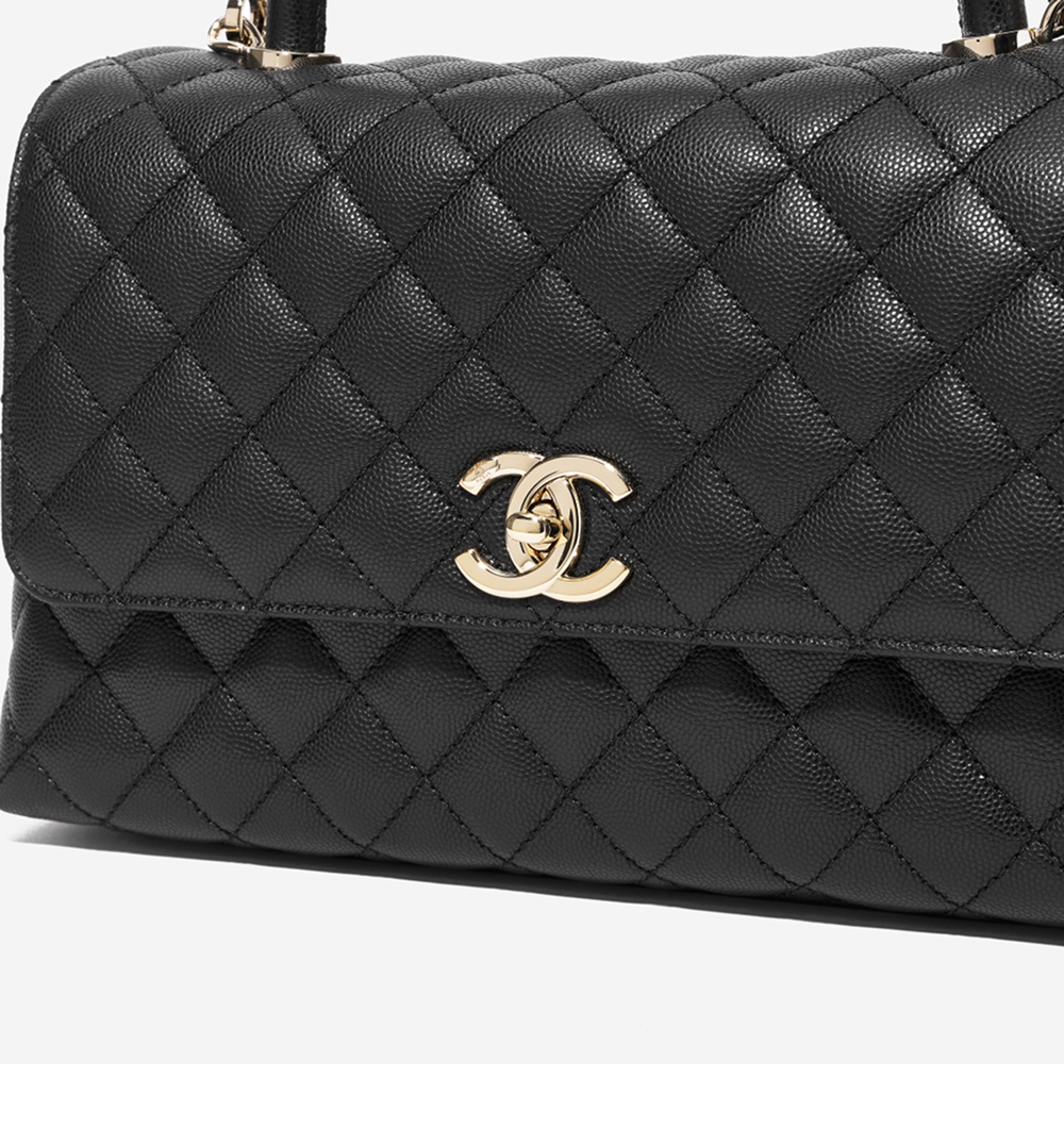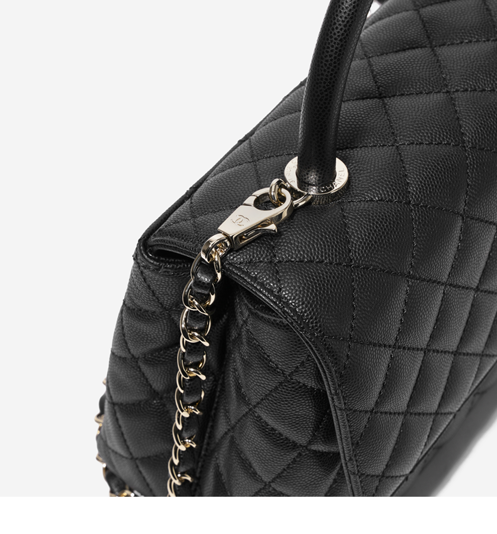 샤넬 핸들 장식의 미디움 플랩백 그레인드 카프스킨 & 골드 메탈 블랙