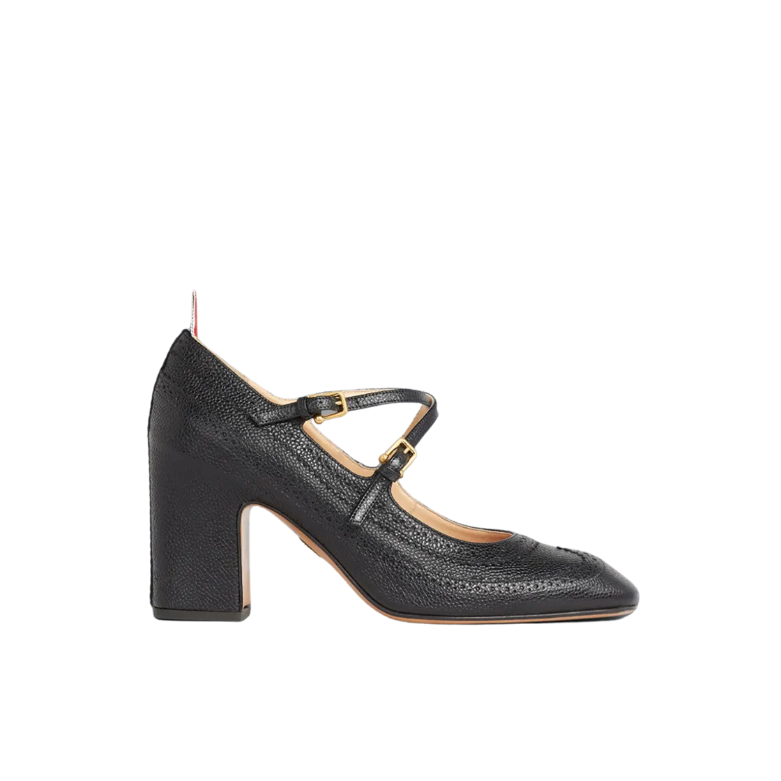 (W) Thom Browne Pebble Grain Leather Brogued 75mm Block Heel Criss Cross Mary Jane Heel Black