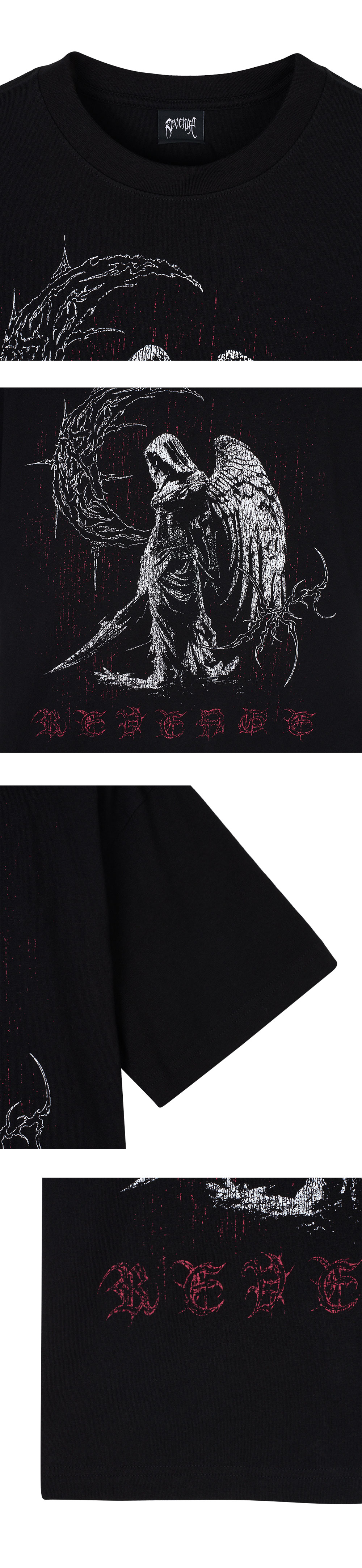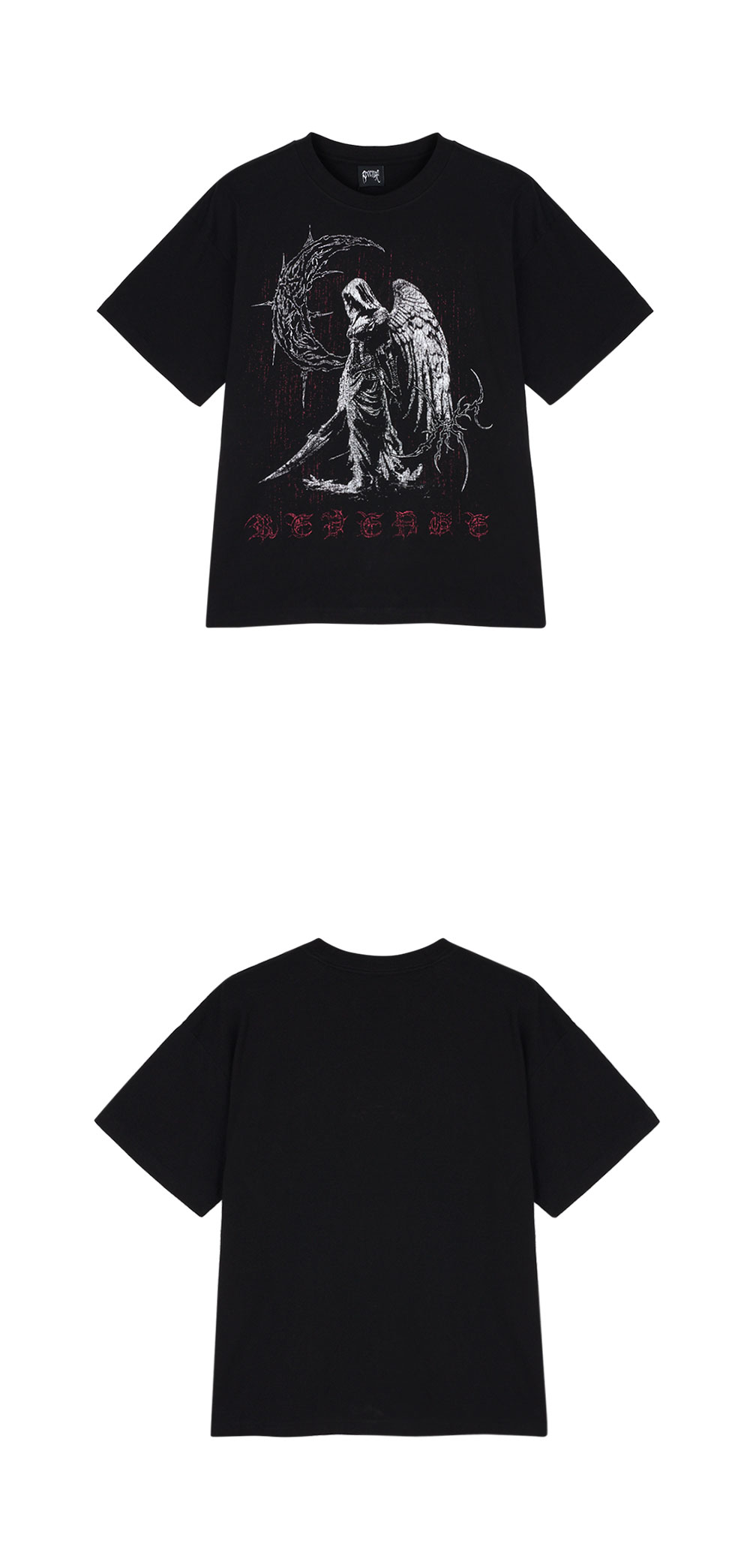 강렬한 로고 프린팅이 매력적인 리벤지의 사이드 티 블랙입니다. - 면 100% - 저지 티 - 여유로운 핏 - Certilogo 인증