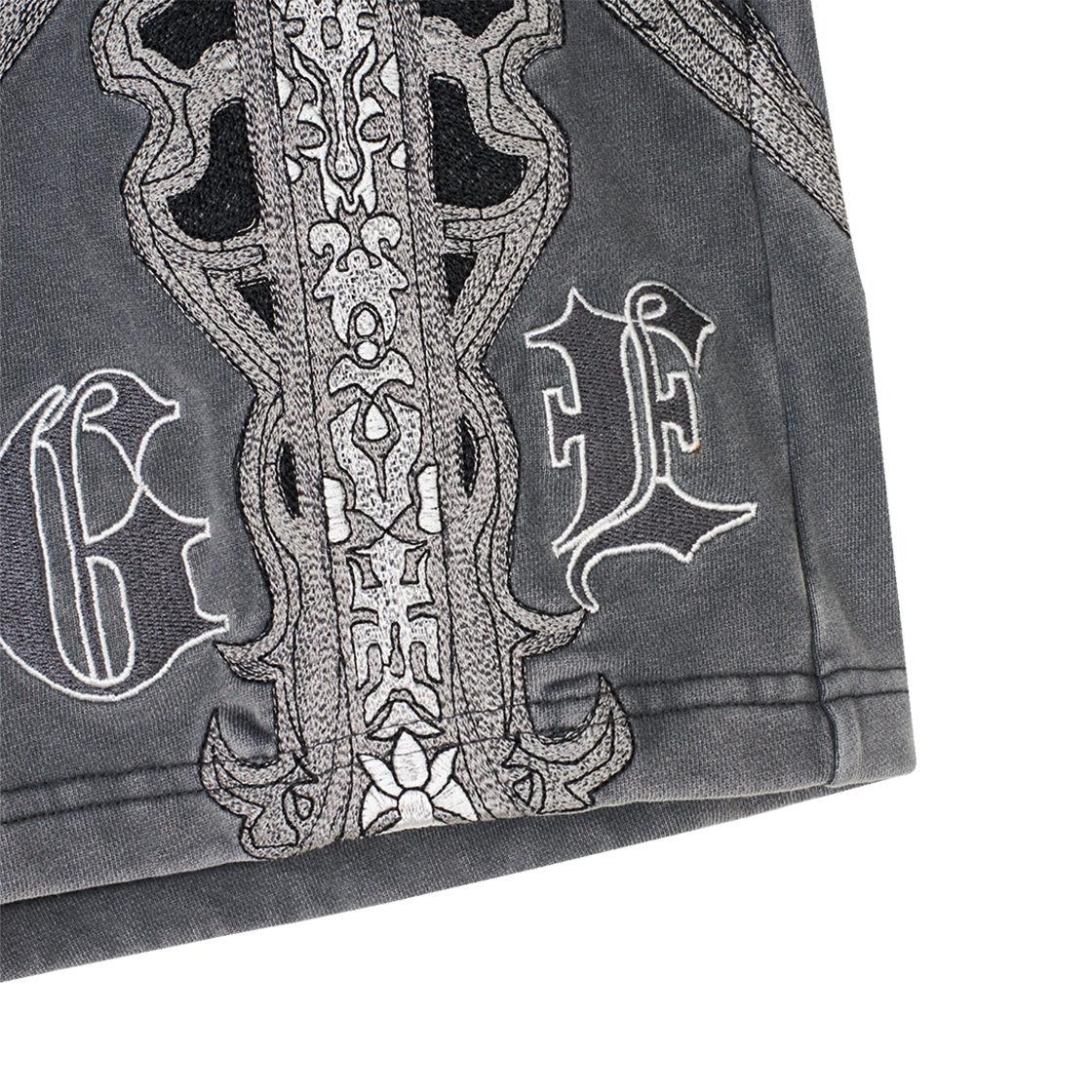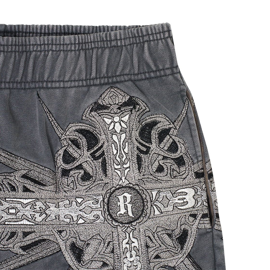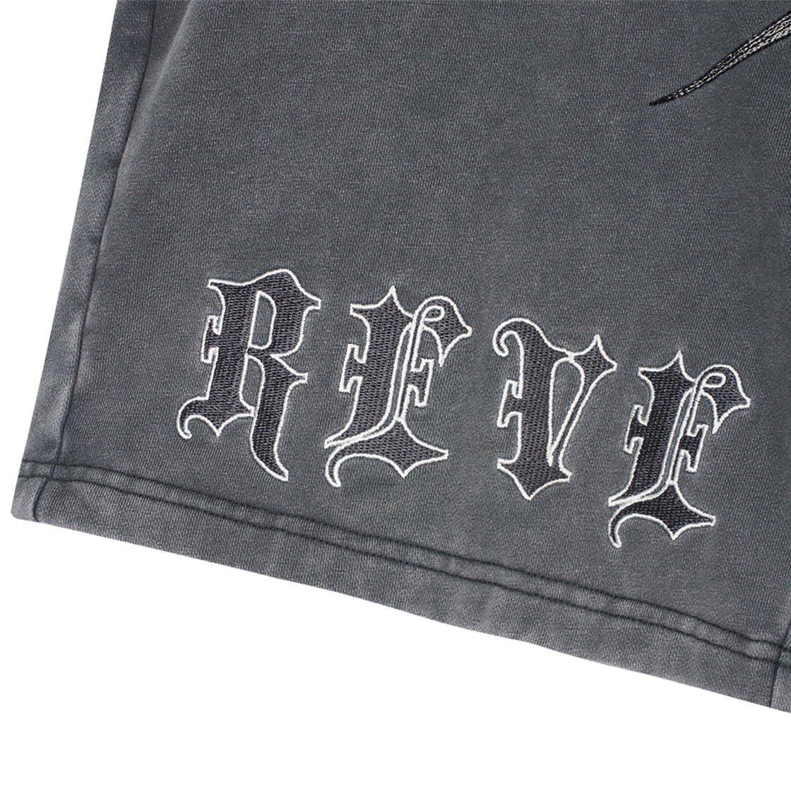 앞면에 고밀도 자수 디테일이 매력적인 리벤지의 스파이크 크로스 쇼츠 그레이입니다. - 사이드 백 포켓 - 드로스트링 웨이스트 - 릴렉스 핏