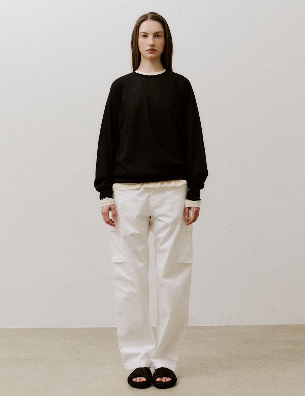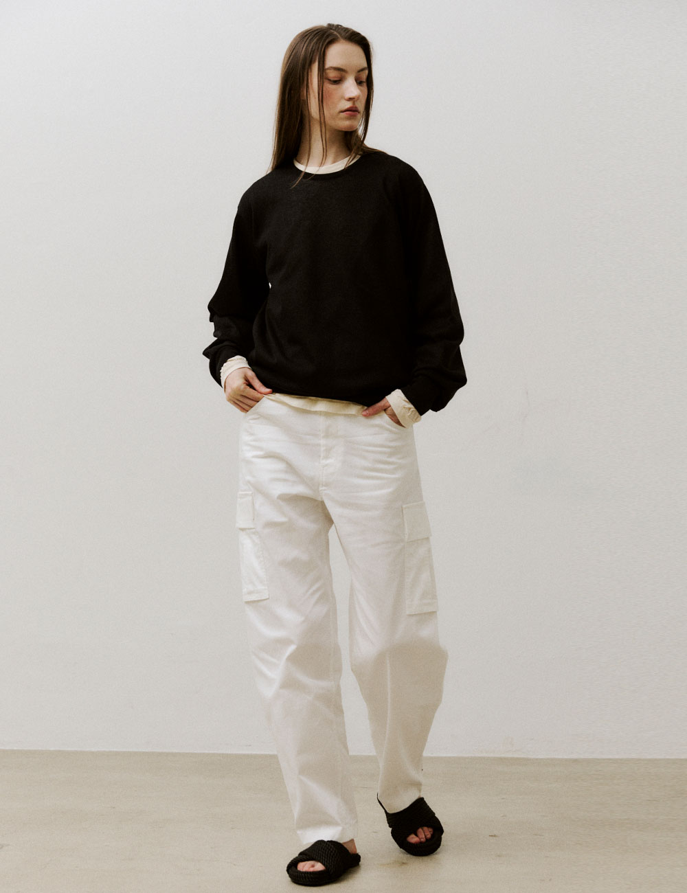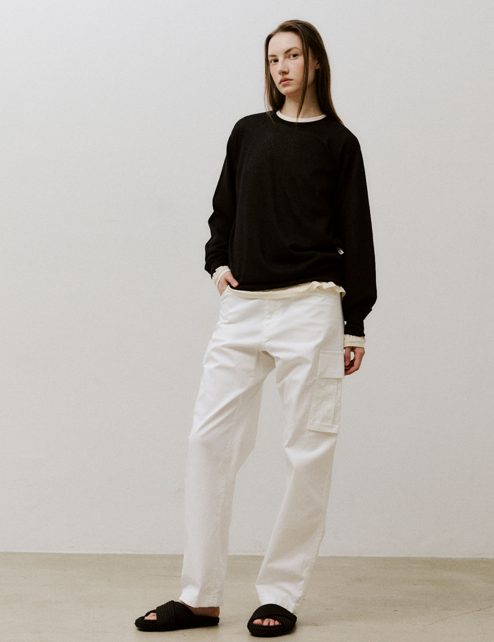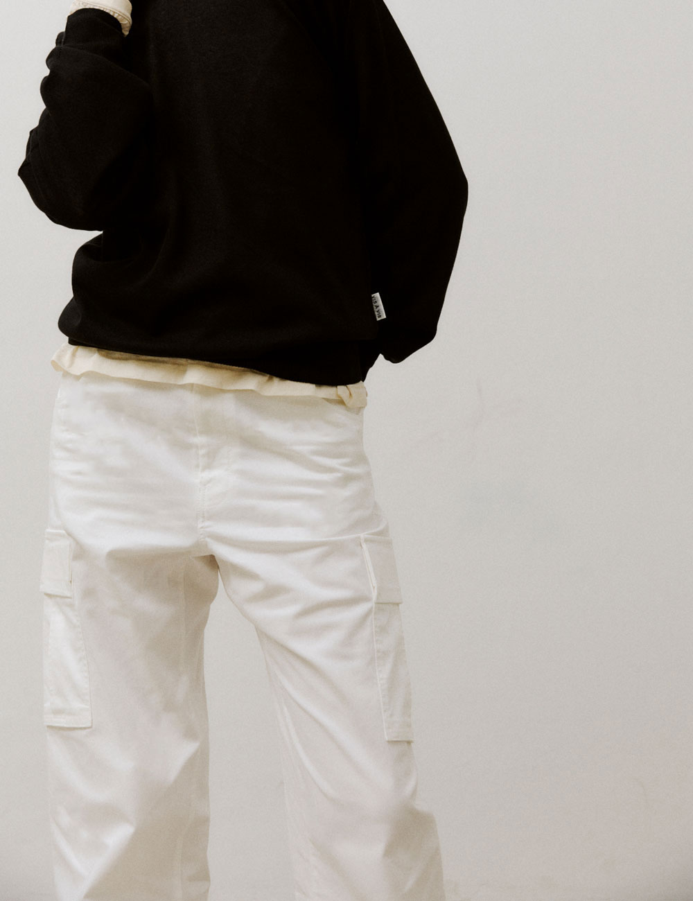 - 루즈 핏의 카고 팬츠 - 수입 원단으로 제작하여 편안한 착용감 - 밑단 턱 디테일과 배럴 핏 - VIS A VIS의 시그니처 디자인