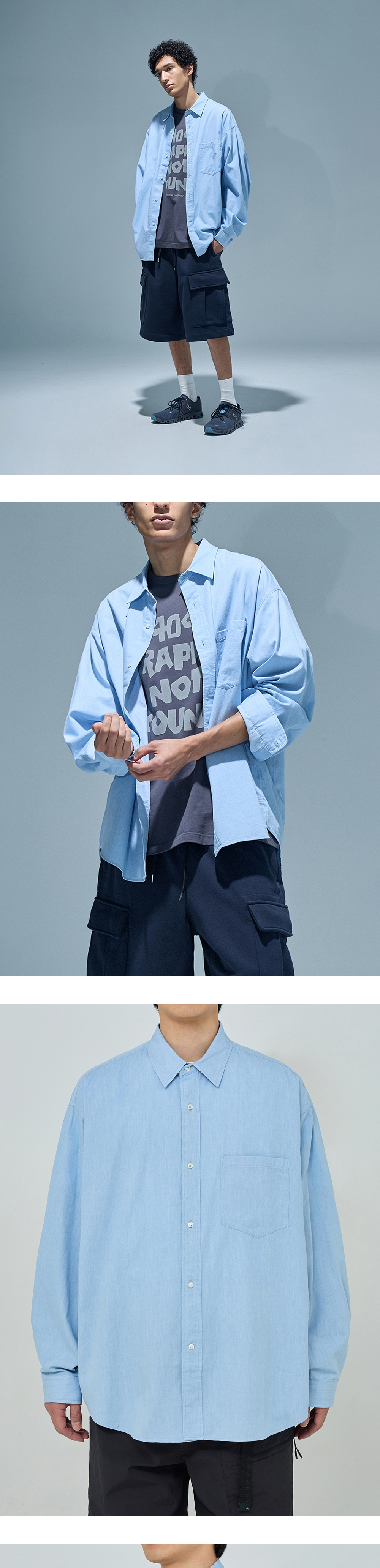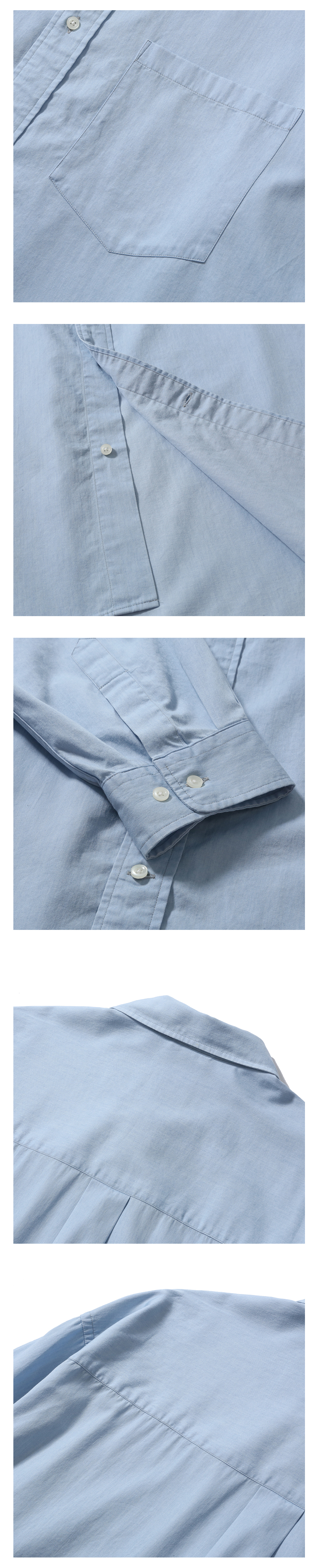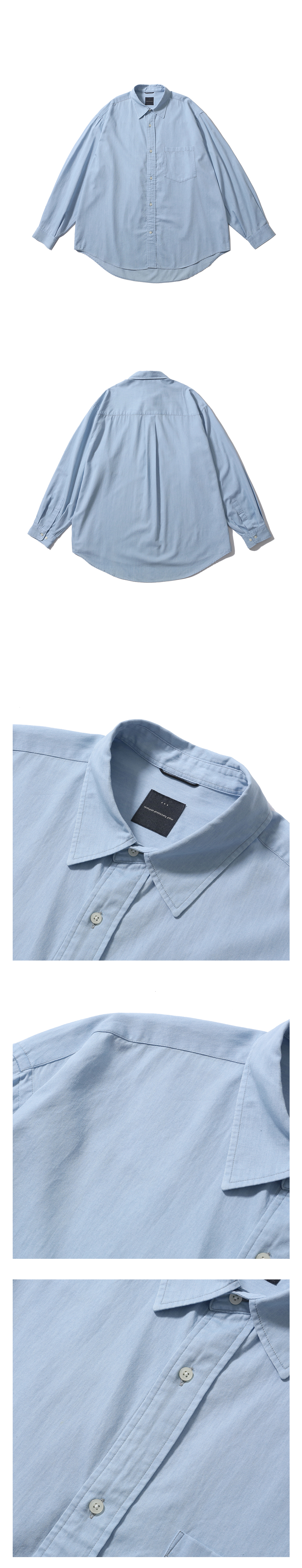 모이프의 기본 유니폼 셔츠 · 여유 있는 오버사이즈 실루엣. · 고밀도의 바이오 워싱 처리한 면 원단 사용. · 기본에 충실한 셔츠 디테일. · 낮은 칼라 높이로 캐주얼한 분위기 연출. · 사이즈 조절이 가능한 소매 커프스 사양.