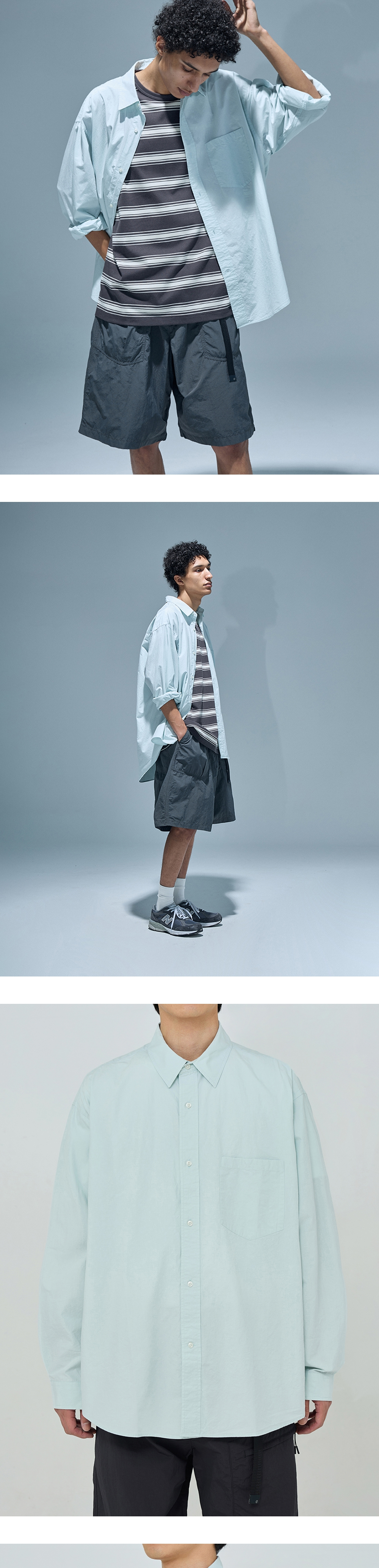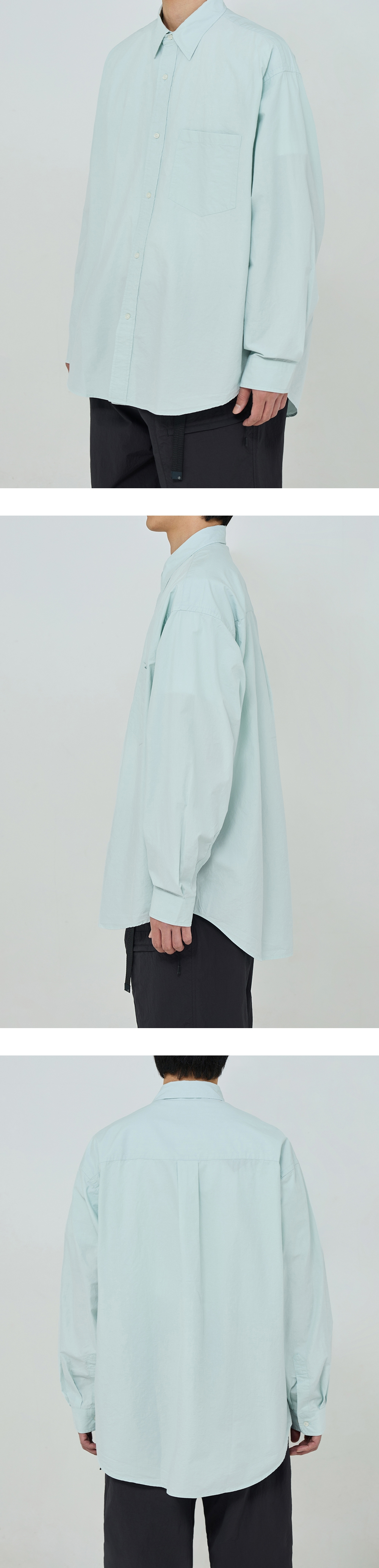 모이프의 기본 유니폼 셔츠 · 여유 있는 오버사이즈 실루엣. · 고밀도의 바이오 워싱 처리한 면 원단 사용. · 기본에 충실한 셔츠 디테일. · 낮은 칼라 높이로 캐주얼한 분위기 연출. · 사이즈 조절이 가능한 소매 커프스 사양.