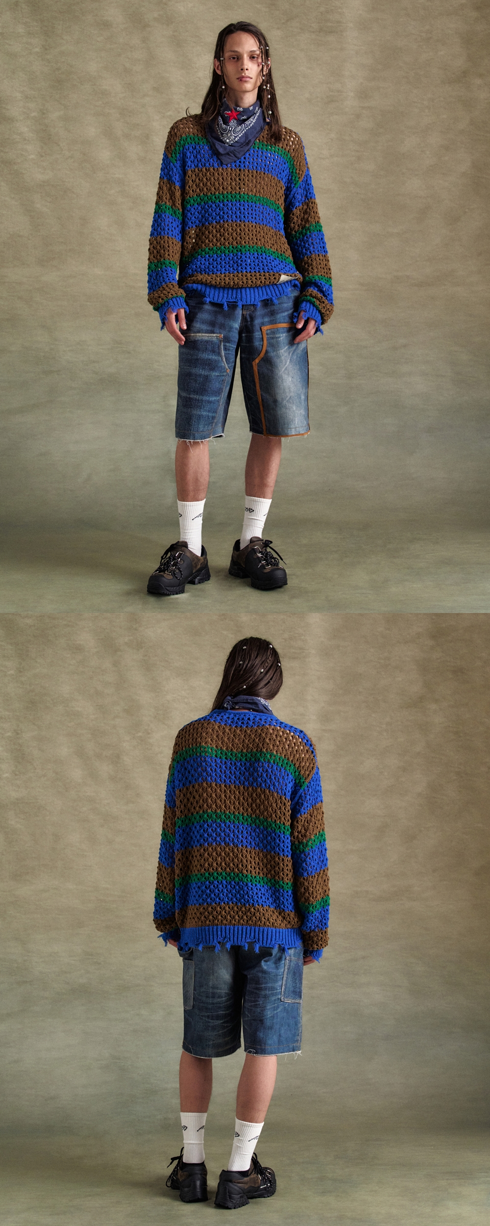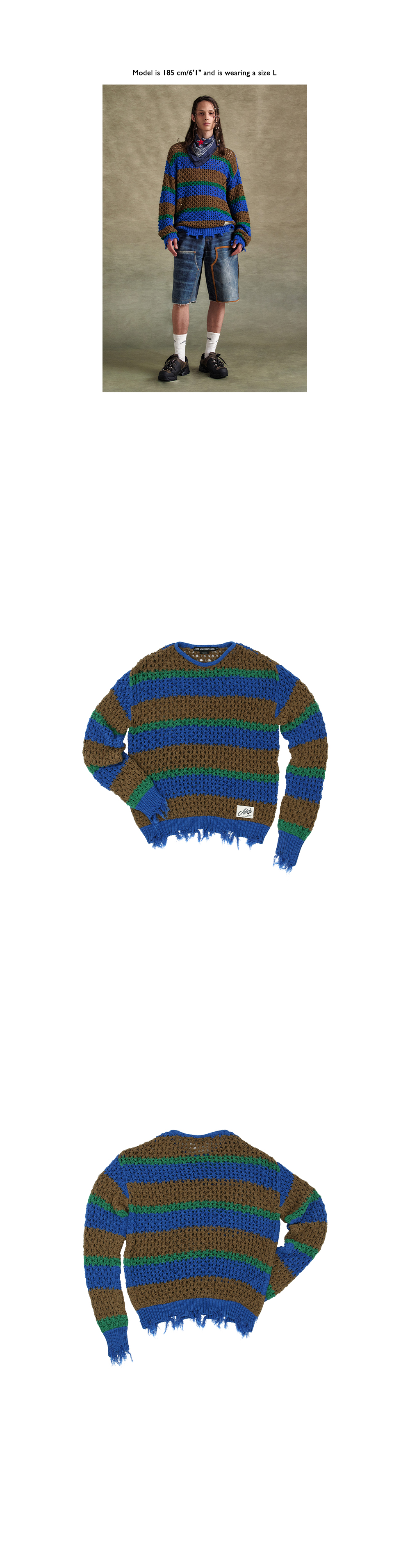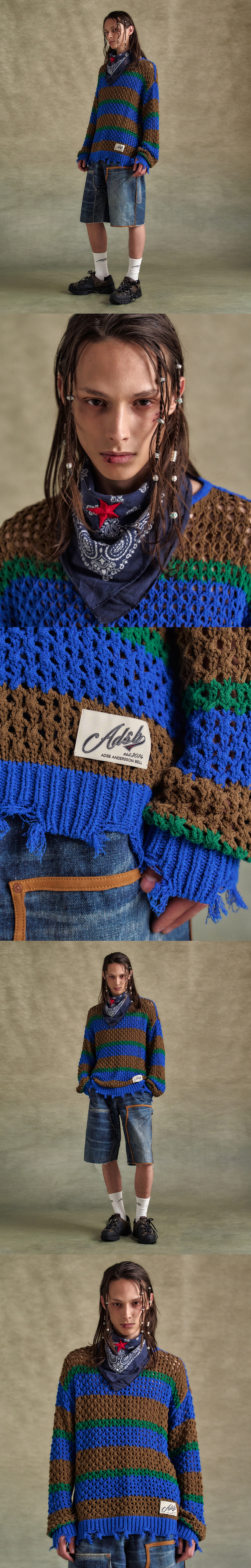 ADSB 앤더슨벨 유니섹스 데미지드 스트라이프 보트넥 스웨터 블루 그린