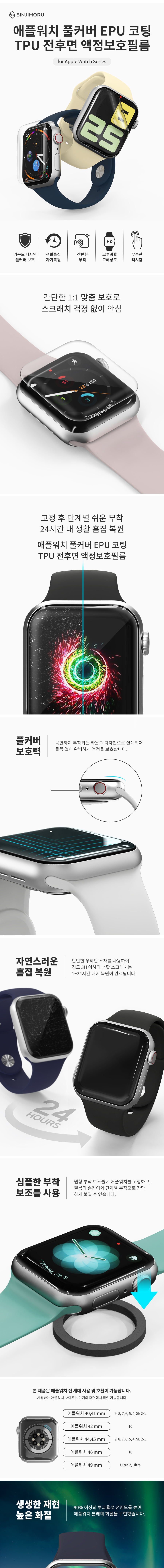 신지모루 애플워치 전면+후면 풀커버 자가복원 액정보호필름 강화유리 11/10/9/8/7/6/SE/3/2세대 울트라 3/2