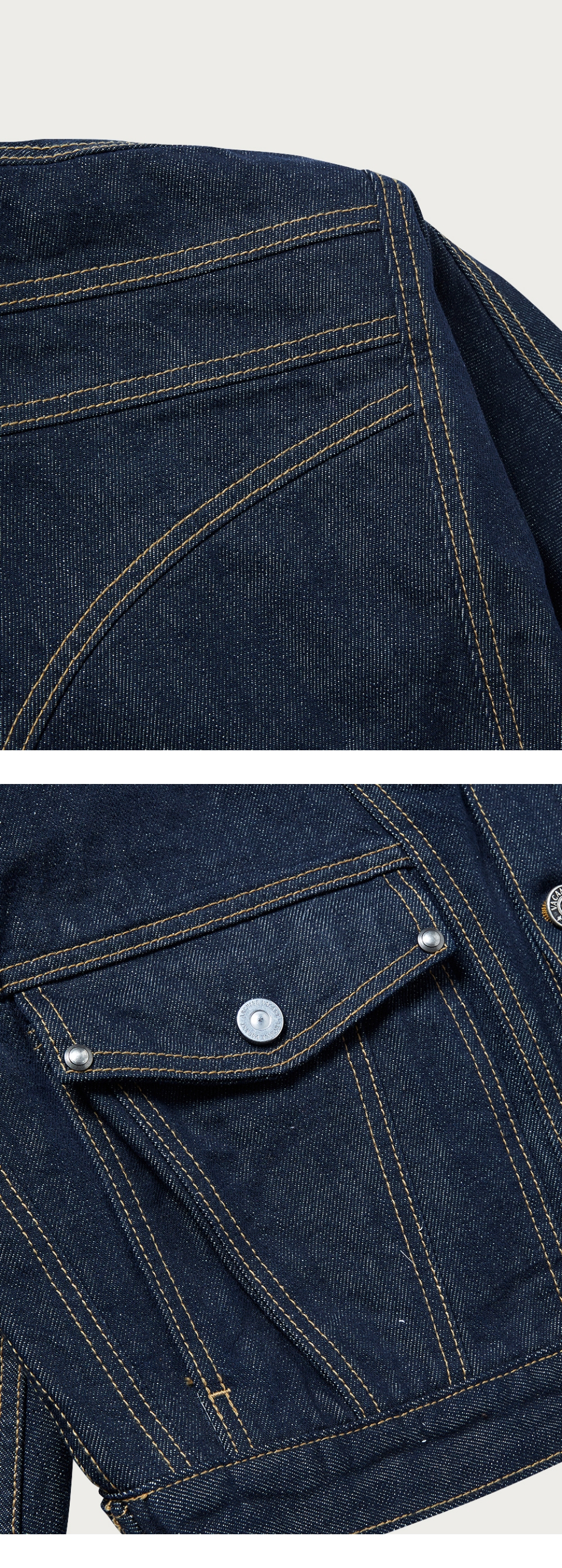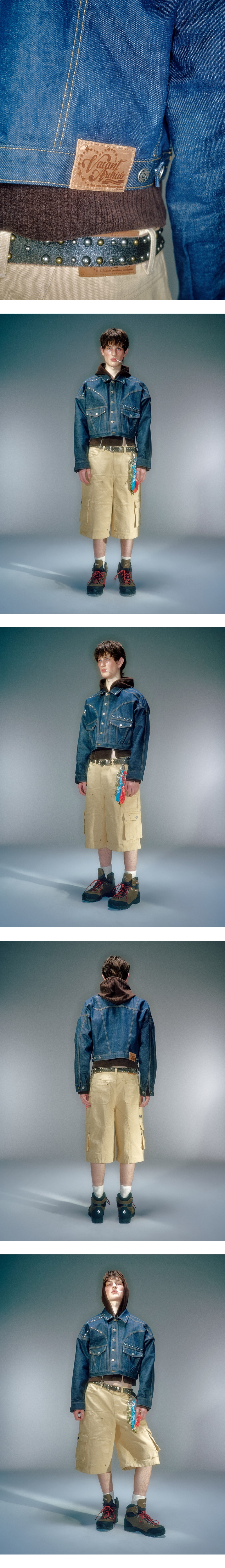 논페이드 데님 소재 사용 전면 부분 입체 포켓 디테일 스터드 장식 넉넉한 품의 크롭한 기장감으로 몸에 편안하게 맞는 실루엣 연출