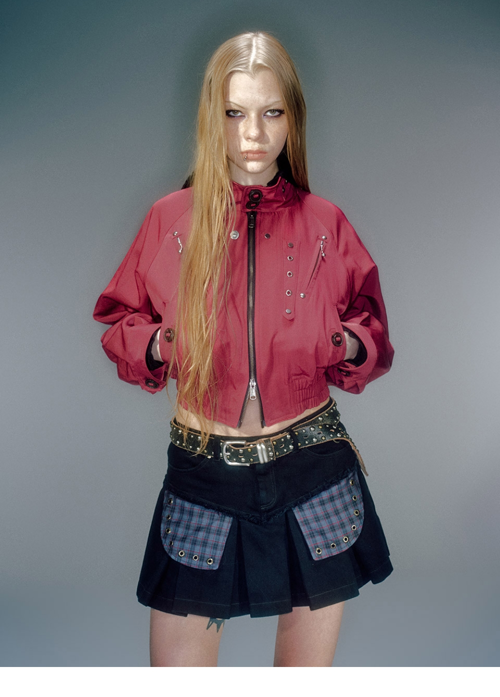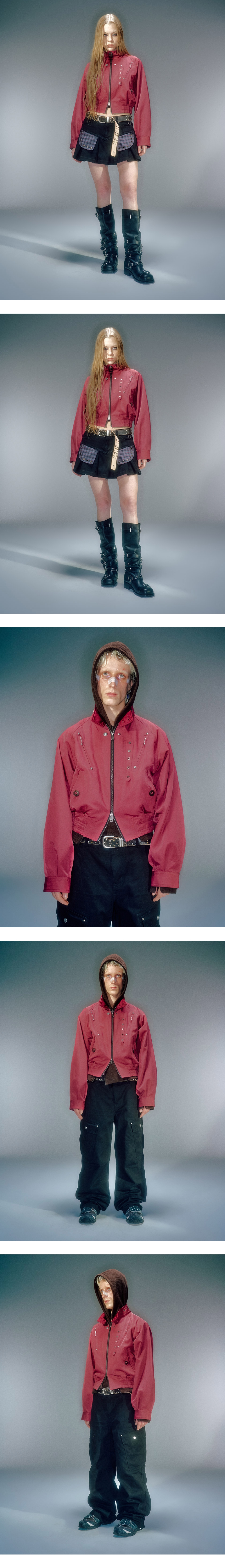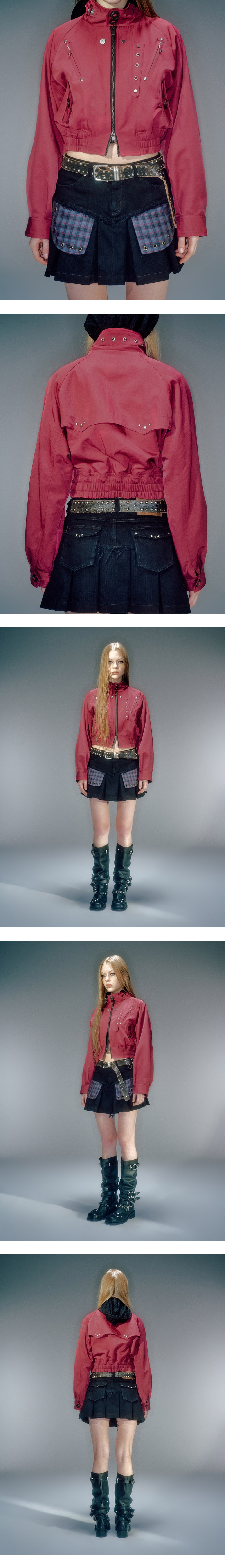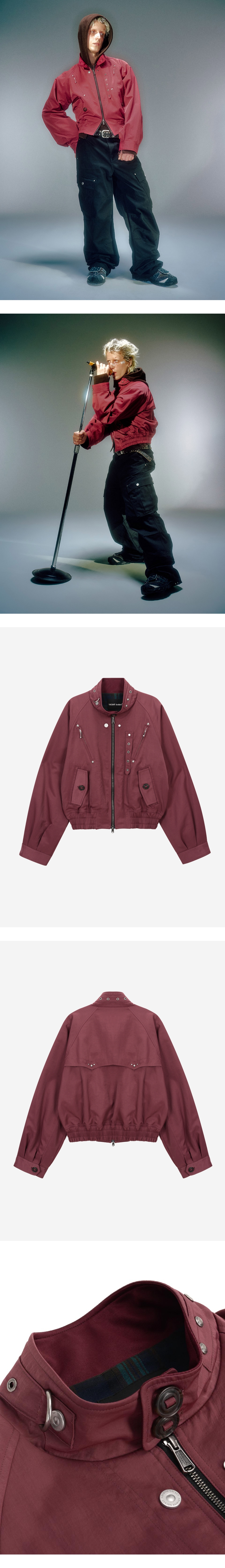 베이컨트 제작 스냅 사용 YKK 지퍼 사용 넉넉하지만 크롭한 실루엣 연춡 전면부 비죠 디테일 넥 안쪽 부분 시보리 덧댐으로 편안한 착용감