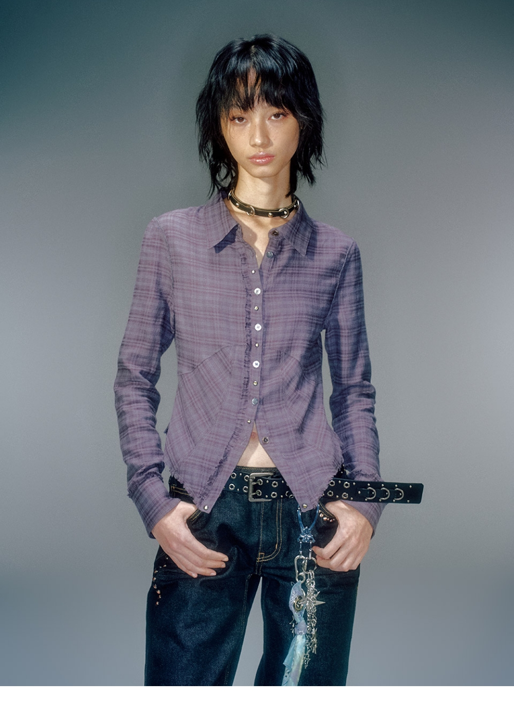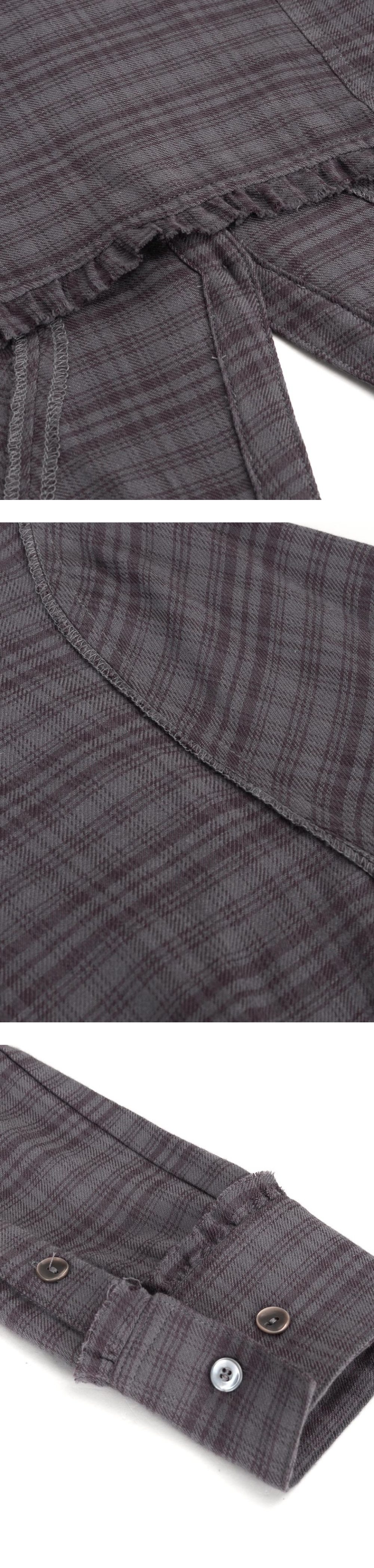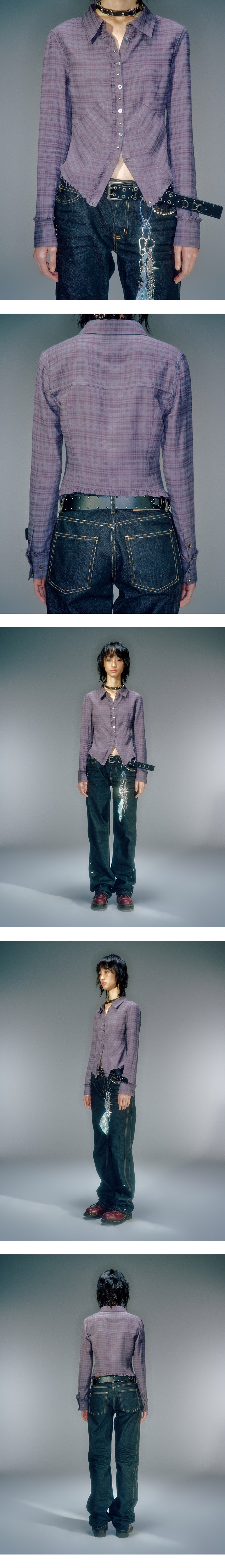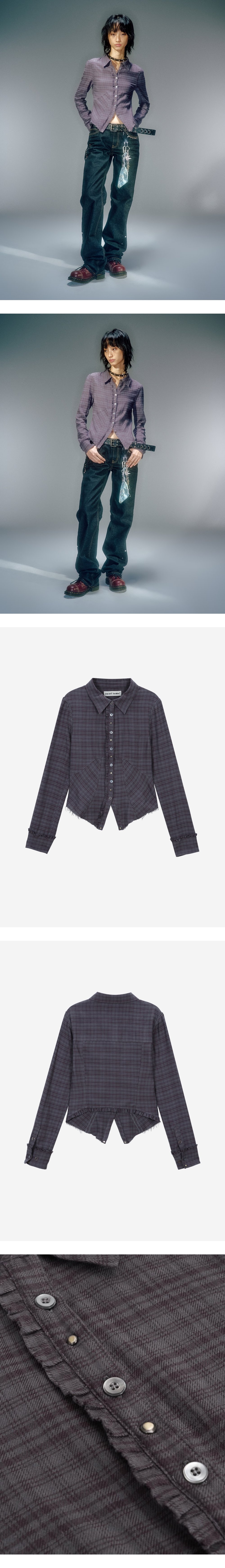 빈티지한 컬러 웨이의 체크 셔츠 슬림한 핏과 절개로 라인 강조된 디자인 단추 배색과 앤틱 리벳 교차 디자인으로 빈티지 무드 연출 앞/뒤판, 소매 프릴 장식