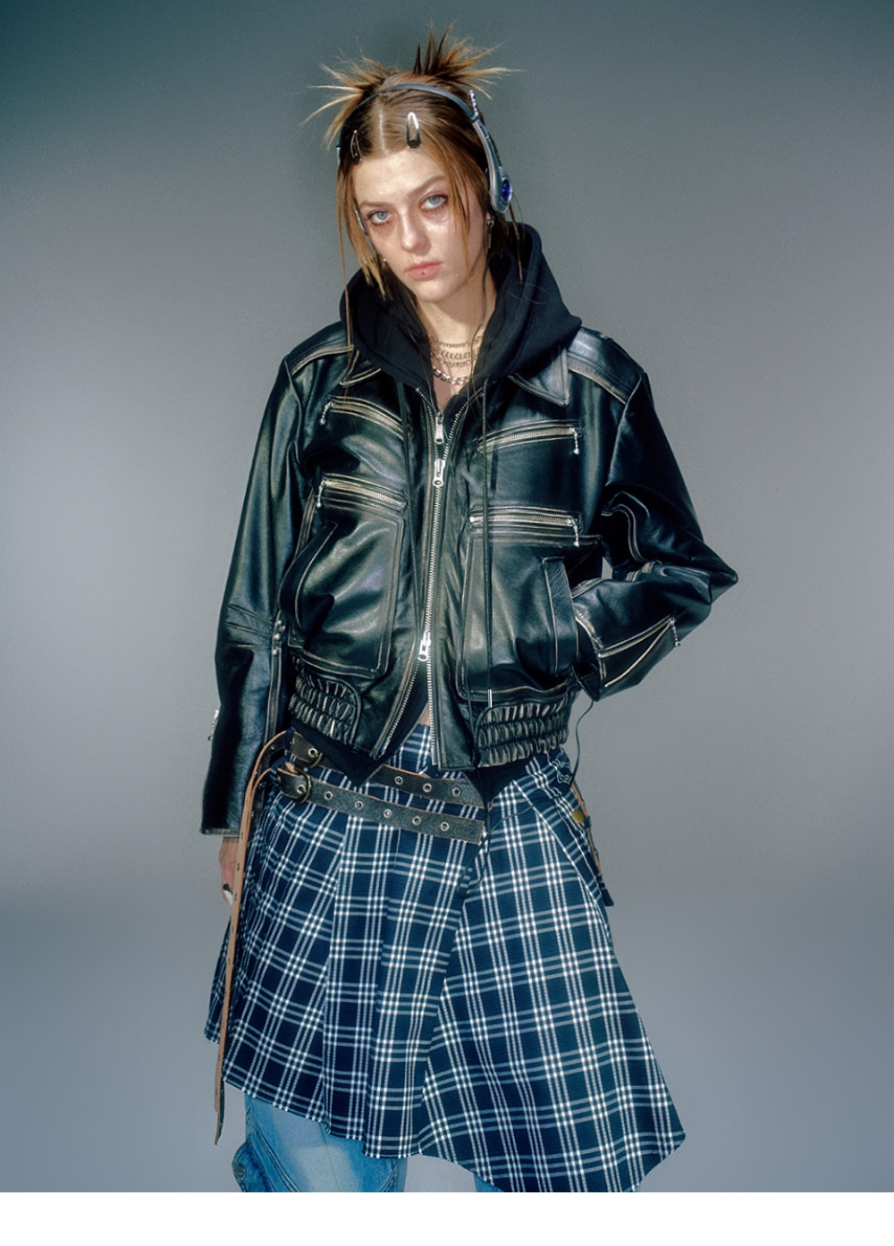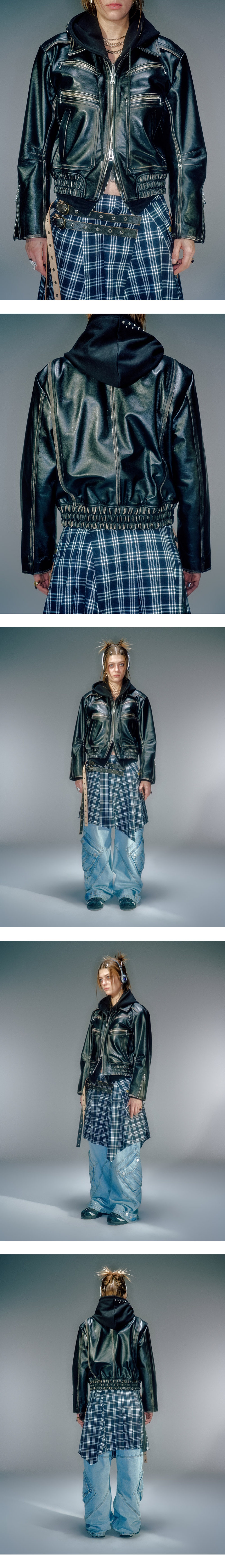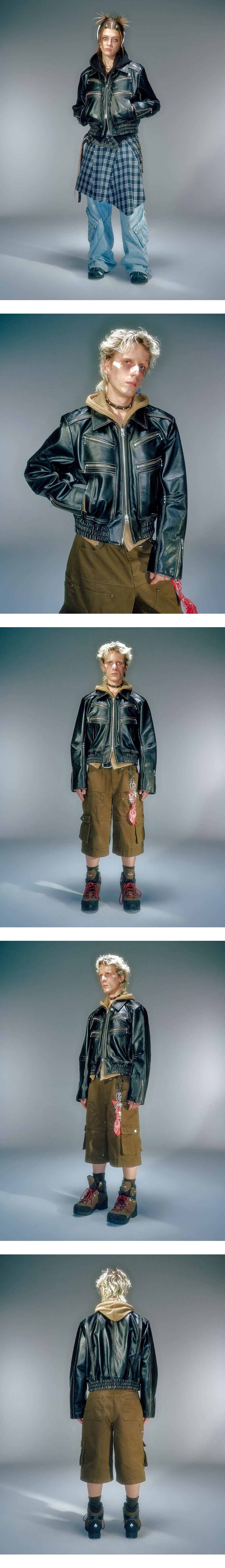 소가죽 소재 사용 세미 와이드 실루엣 전면 지퍼 디자인 디테일 후면 액션 플리츠 디테일 탑버튼(스냅)으로 다양한 룩킹 연출 YKK 2WAY 지퍼 사용 가죽 전문 클리닝 권장