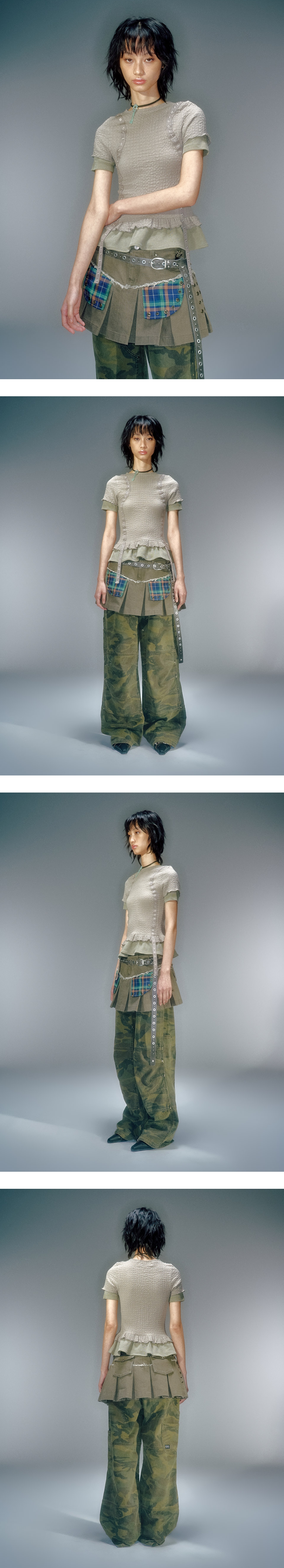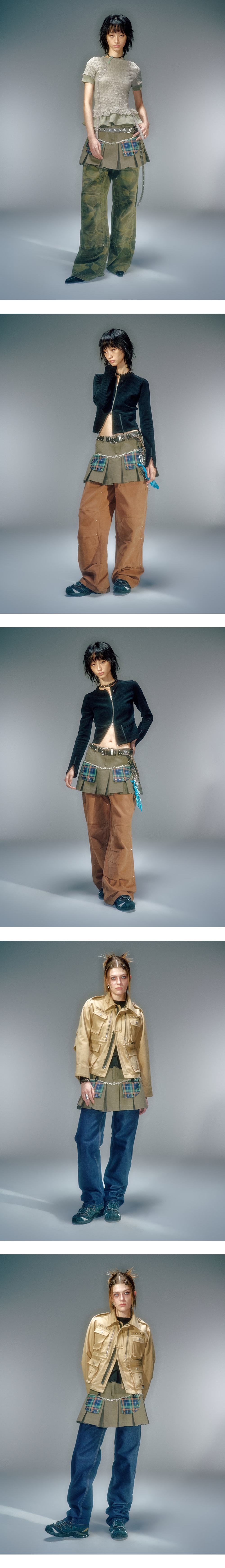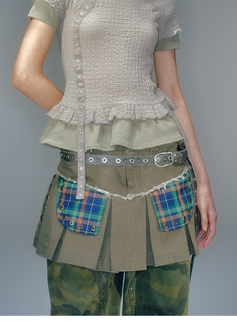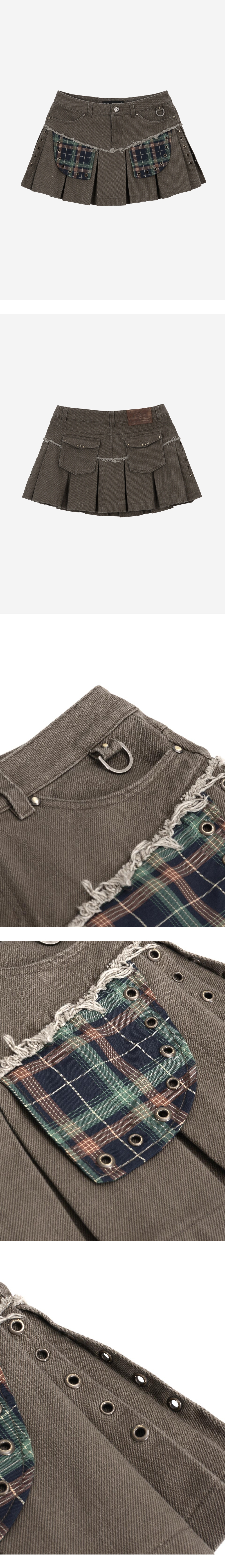 로우 라이즈 플리츠 코튼 스커트 앞뒤 모두 사용 할 수 있는 포켓 전면 체크 아웃 포켓 장식 베이컨트 로고의 오일 레더 라벨 사용