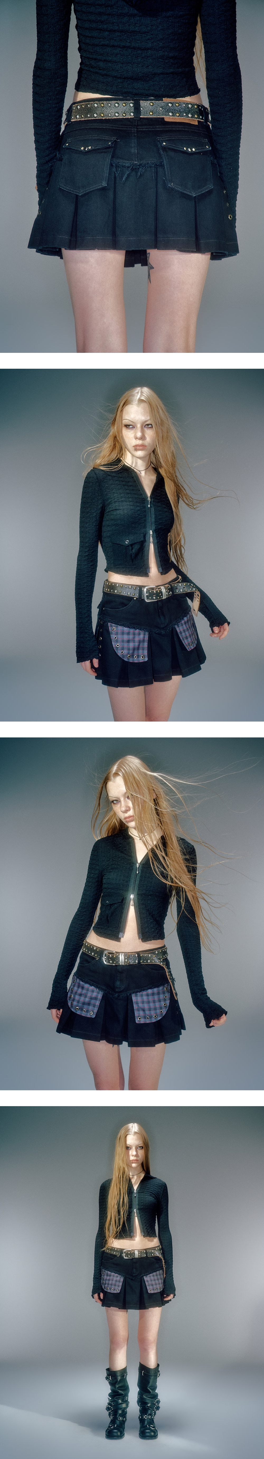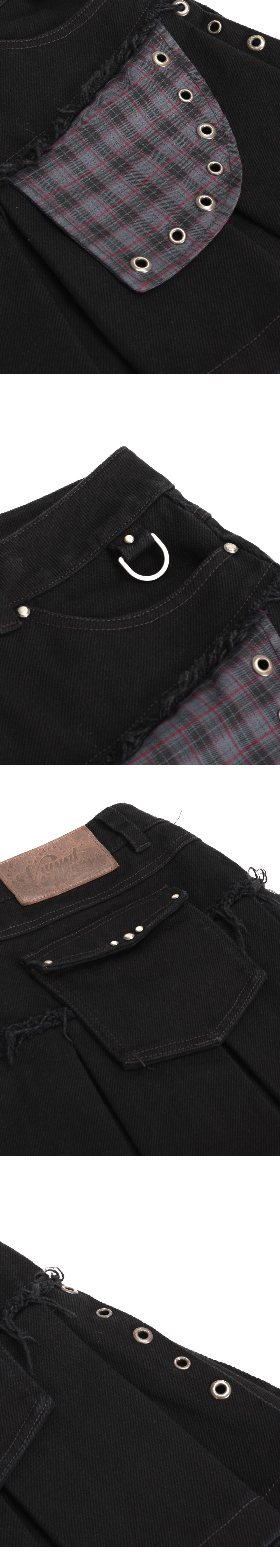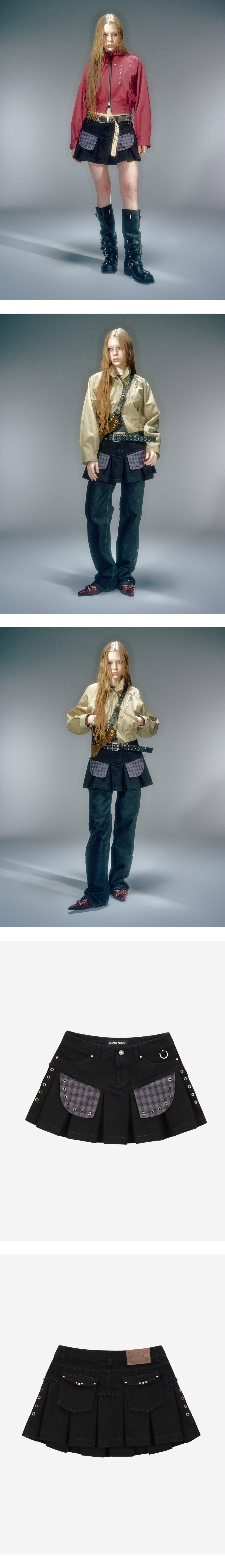 로우 라이즈 플리츠 코튼 스커트 앞뒤 모두 사용 할 수 있는 포켓 전면 체크 아웃 포켓 장식 베이컨트 로고의 오일 레더 라벨 사용