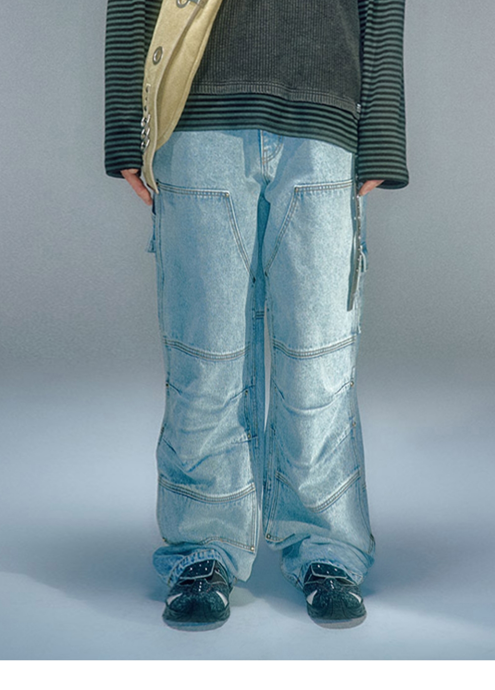 ISKO 원단 사용 와이드 실루엣의 카펜터 베이스 데님팬츠 하단 턱 디테일로 입체적인 실루엣 베이컨트 제작 리벳 아용 더블 포켓 디테일 - 테크니컬적인 패턴 사용으로 F면보다 B면의 총장이 짧아 밑단 끌림 방지