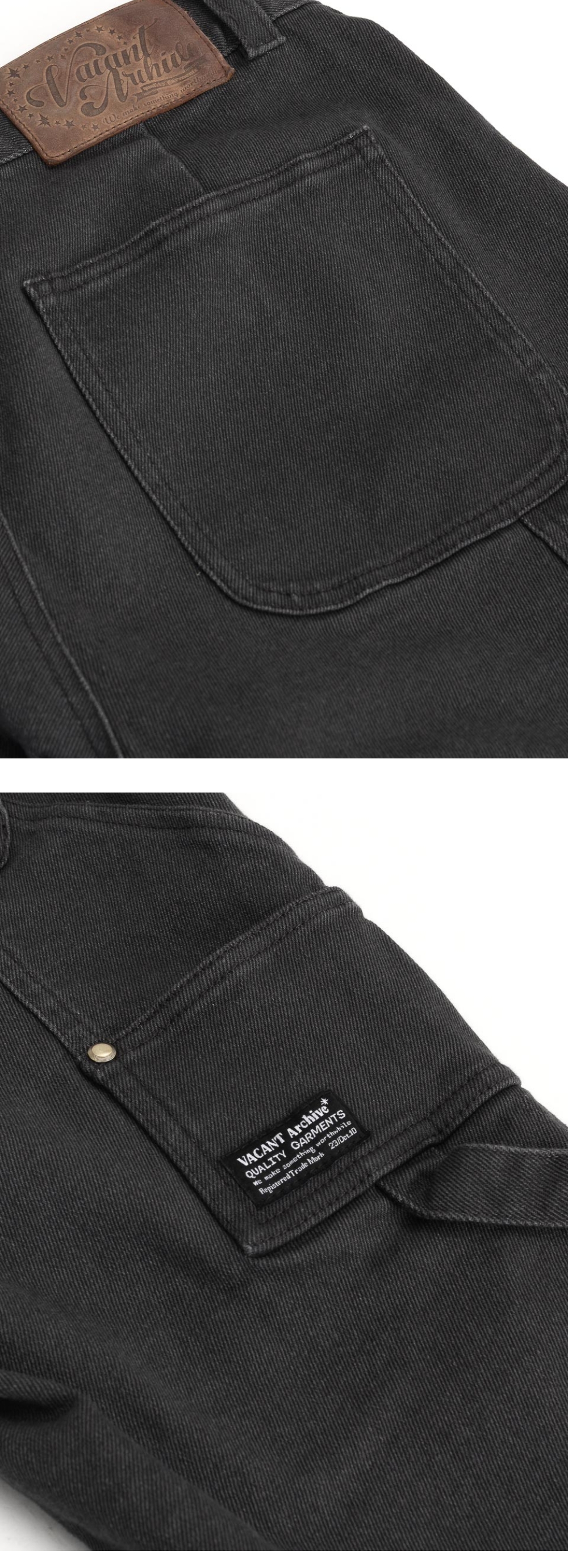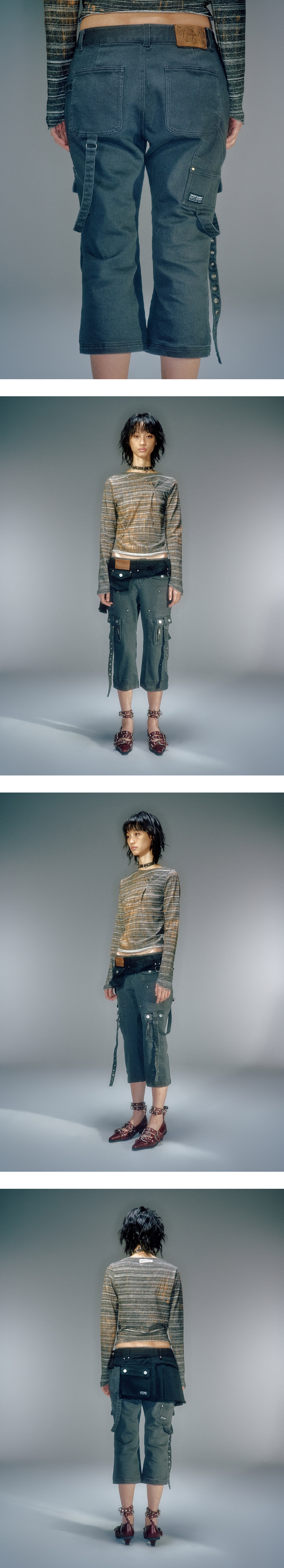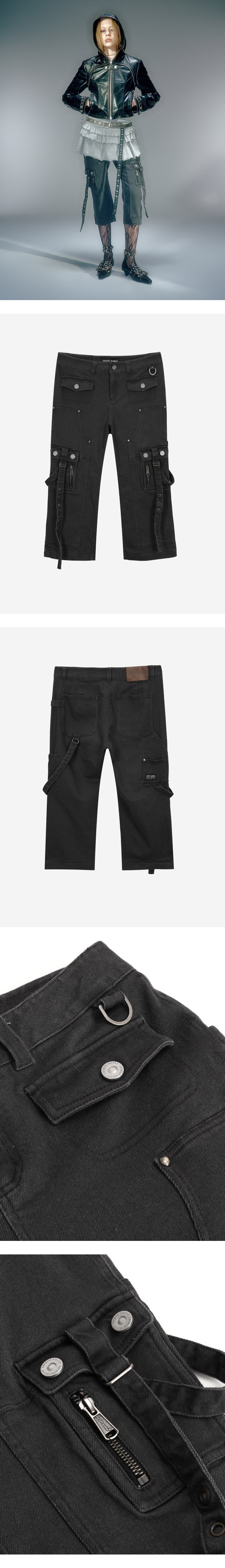 로우라이즈 7부 기장의 카프리 카펜터 워크 팬츠 스판사 함유된 원단 사용으로 편안한 착용감 전면 장식 포켓과 카고 포켓으로 펑크 무드 연출 전면 D링 고리로 키링 고리 활용 가능 베이컨트 로고의 오일 레더 라벨 사용