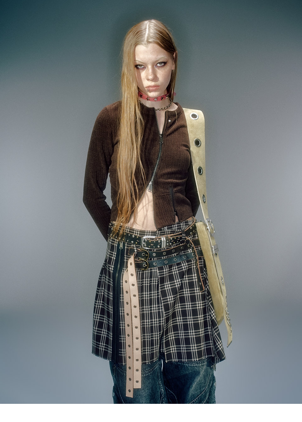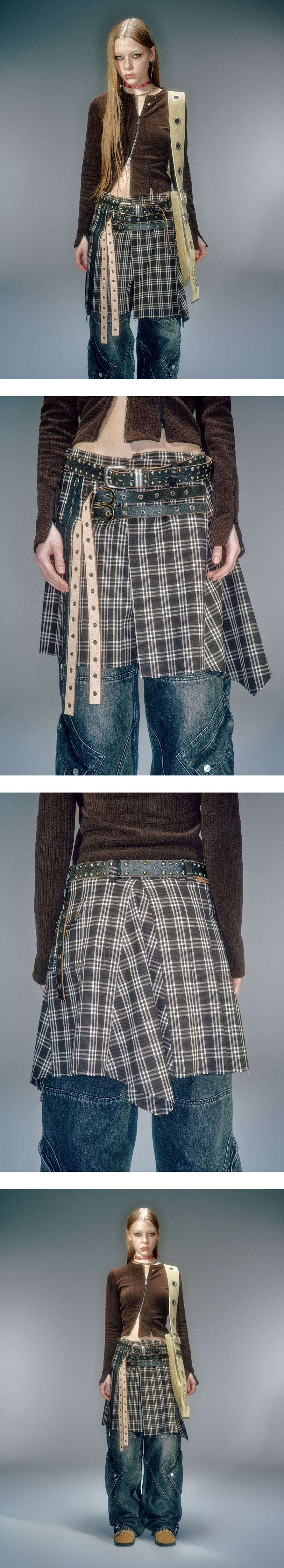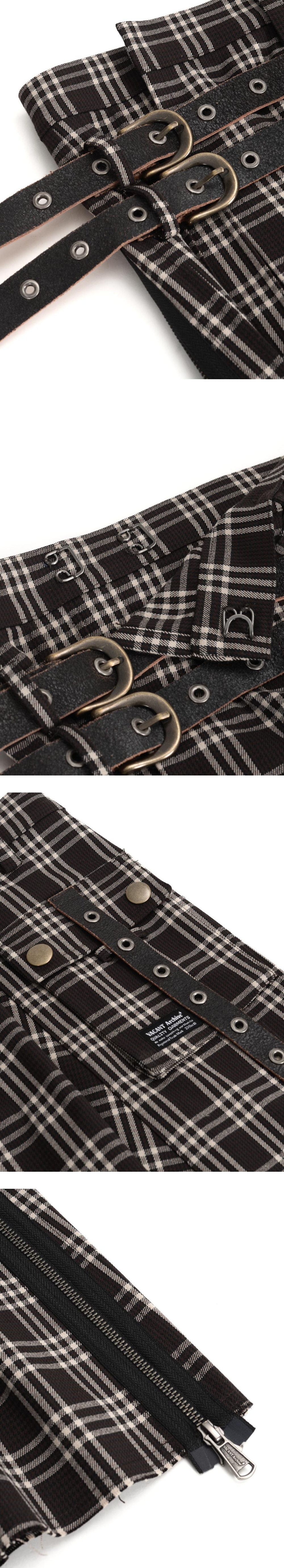 스냅, 후크로 사이즈 조절 가능한 랩스타일 체크 스커트 카우 크랙 레더 사용한 버클 디테일 사이드 카고 포켓 디테일 언발란스한 기장으로 레이어드하여 다양한 룩 연출 가능