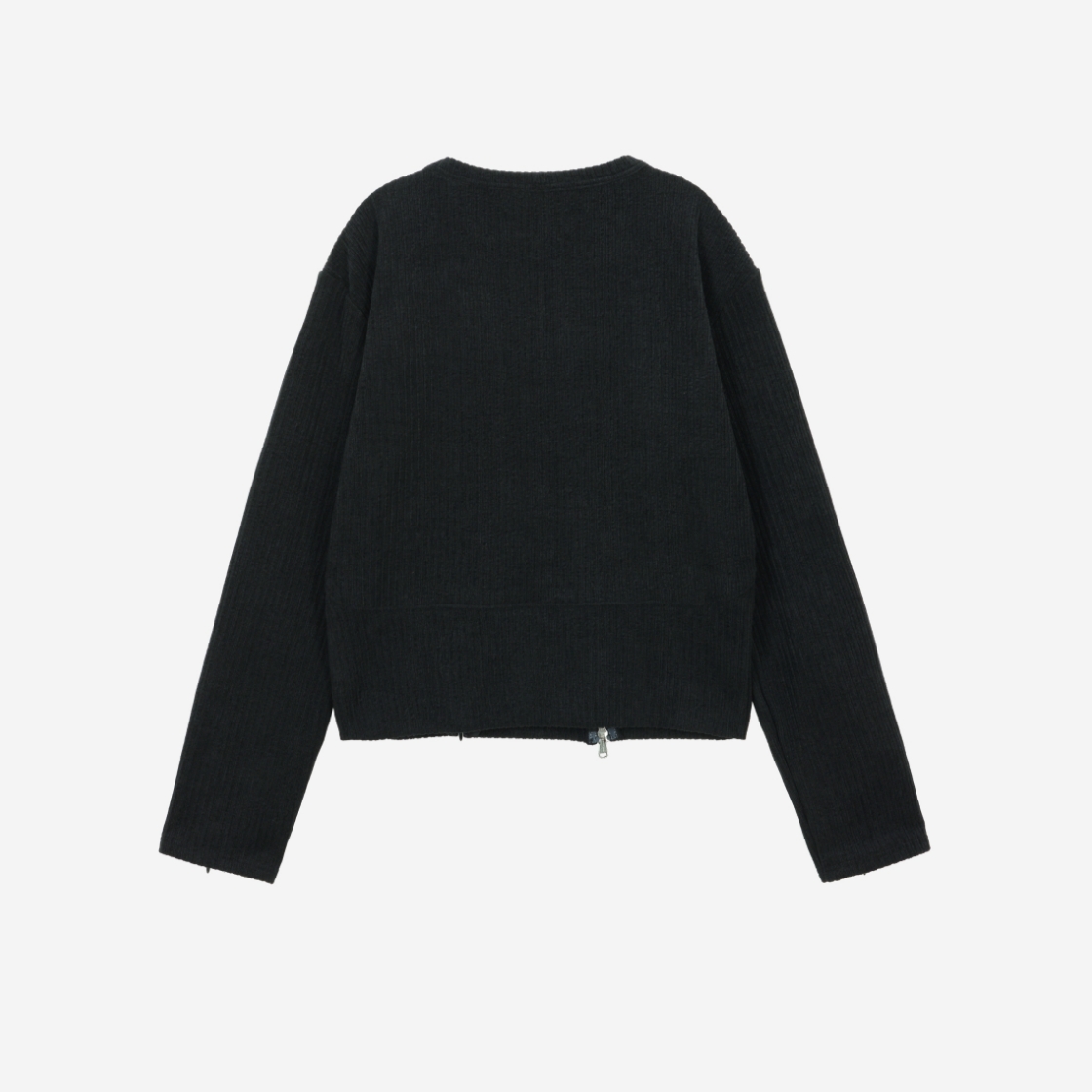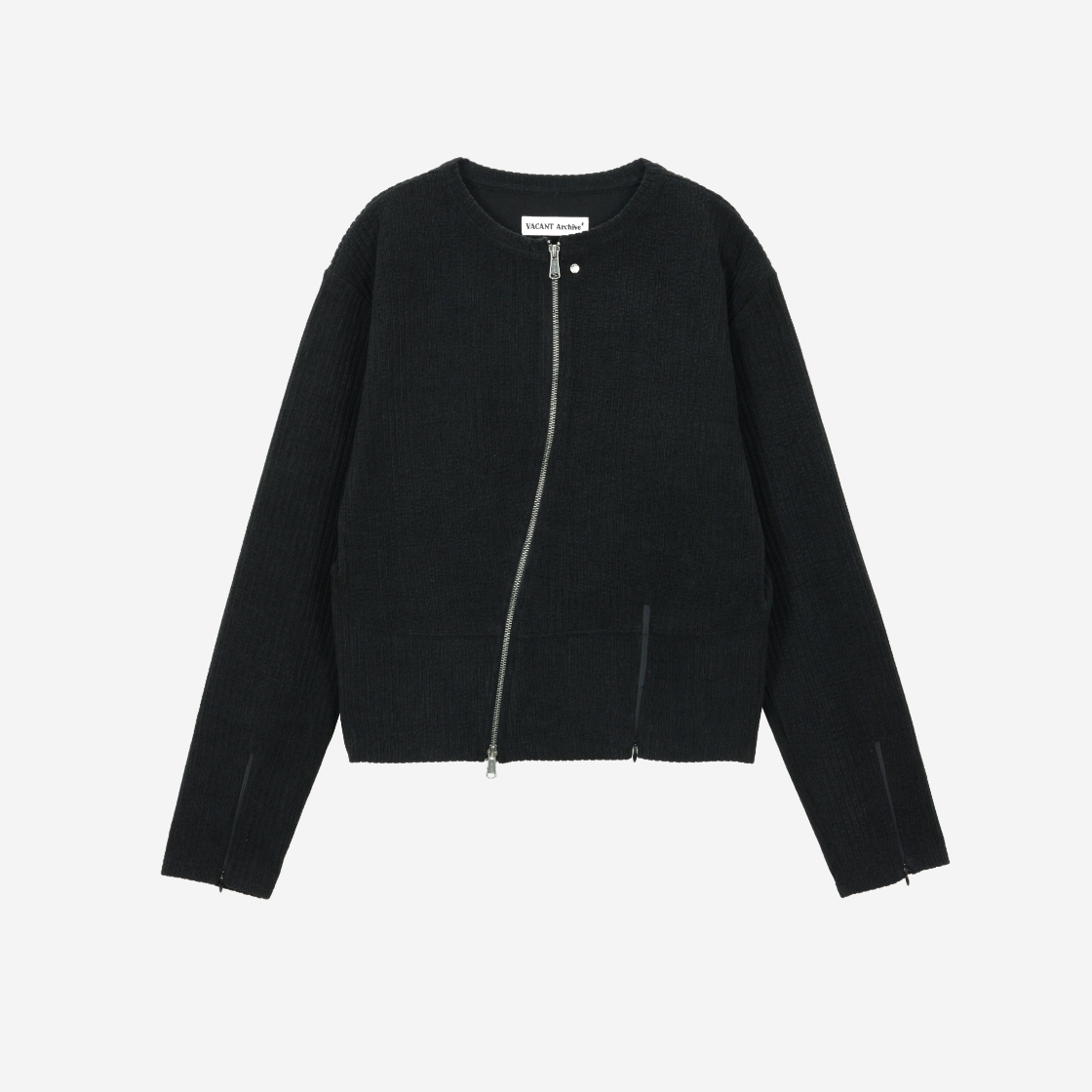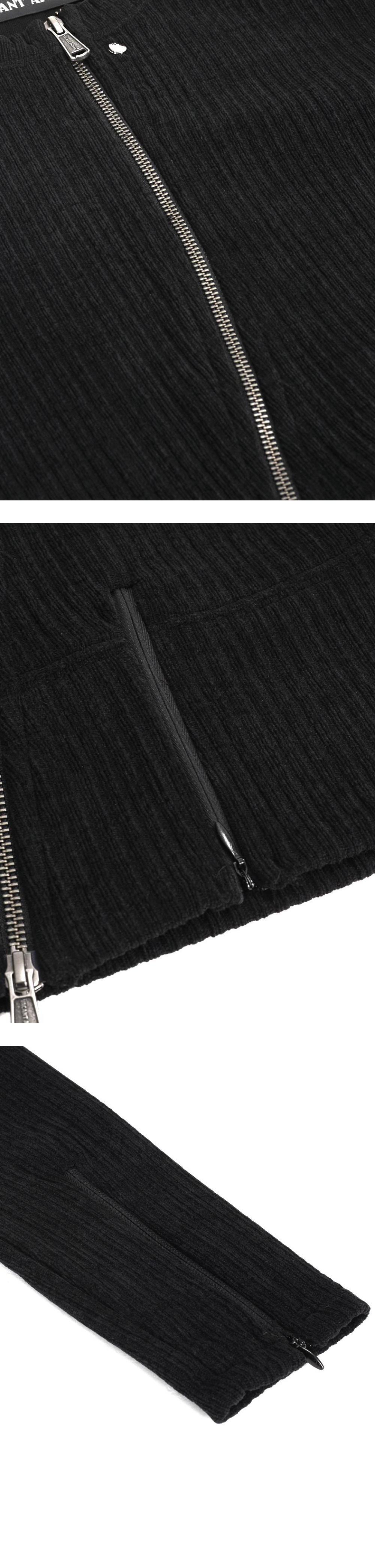 겉면의 기모감 있는 소재로 부드러운 터치감 전면 비대칭 지퍼 디자인 베이컨트 제작 YKK 2WAY 지퍼 사용 베이컨트 제작 코어 라인 리벳 장식 사용 소매 지퍼 여밈 디테일