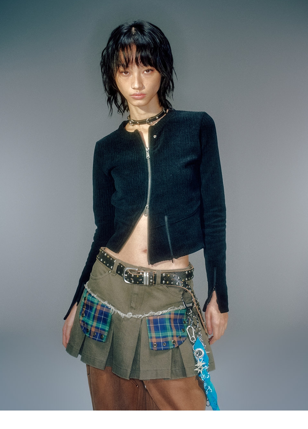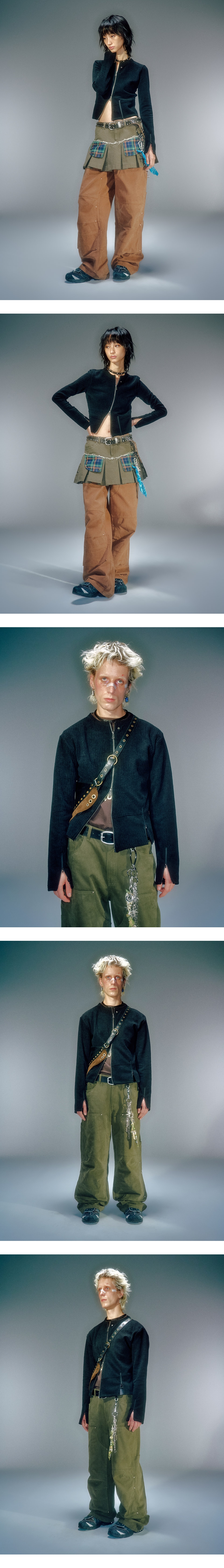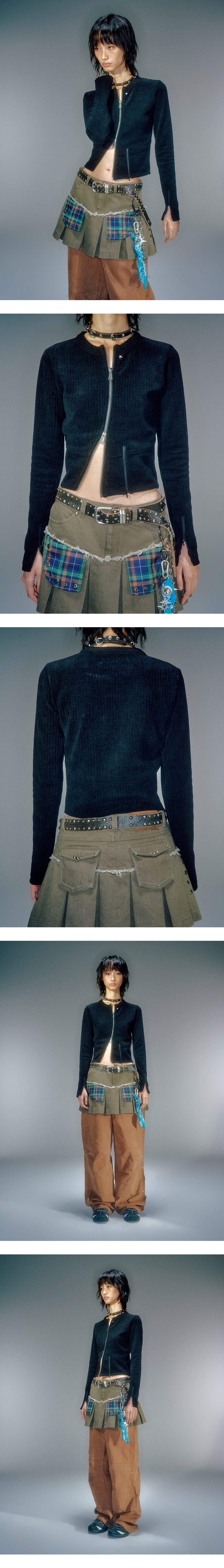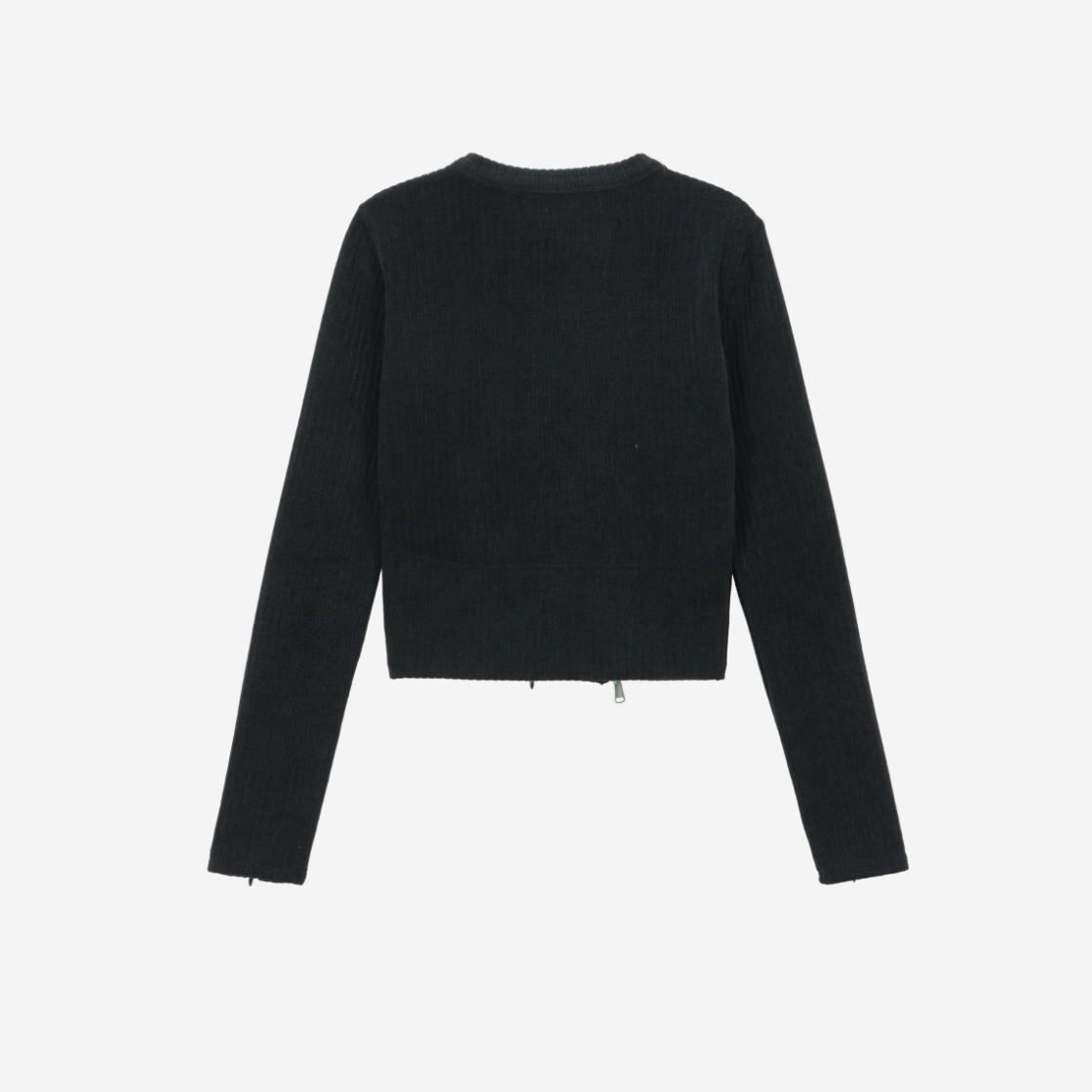 겉면의 기모감 있는 소재로 부드러운 터치감 전면 비대칭 지퍼 디자인 베이컨트 제작 YKK 2WAY 지퍼 사용 베이컨트 제작 코어 라인 리벳 장식 사용 소매 지퍼 여밈 디테일