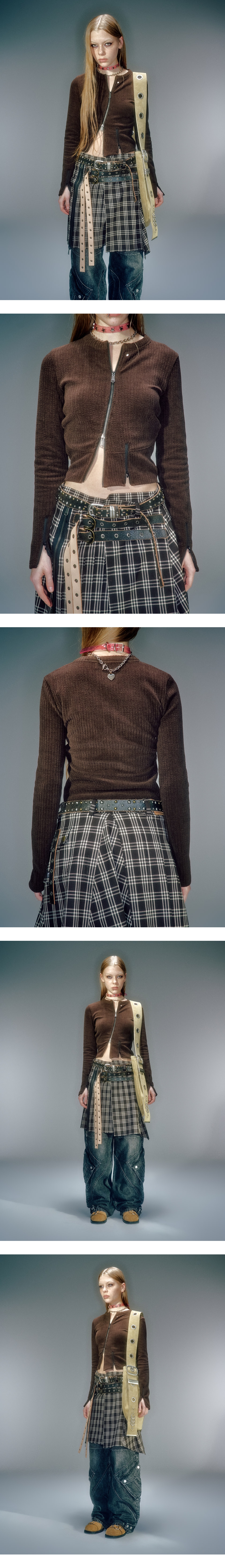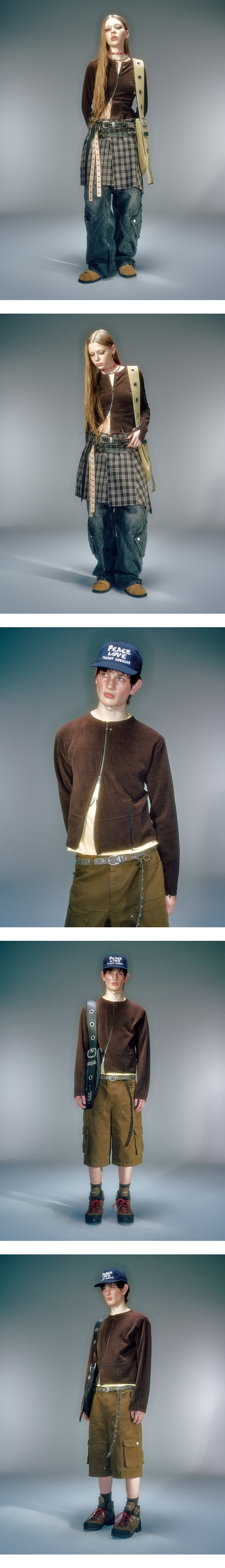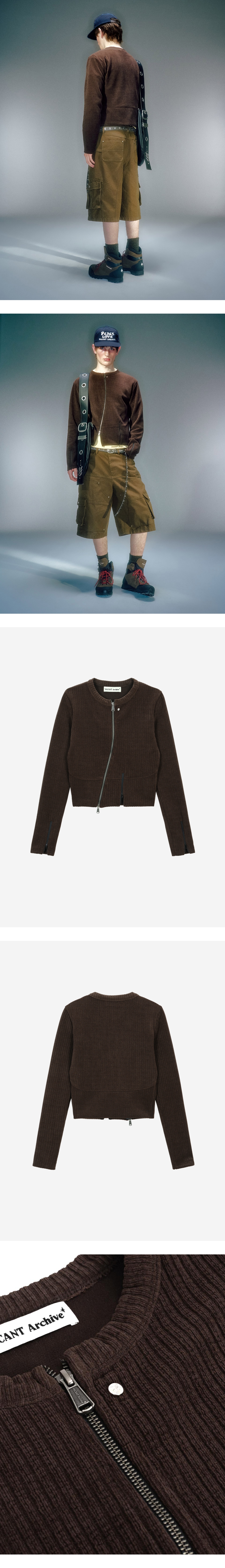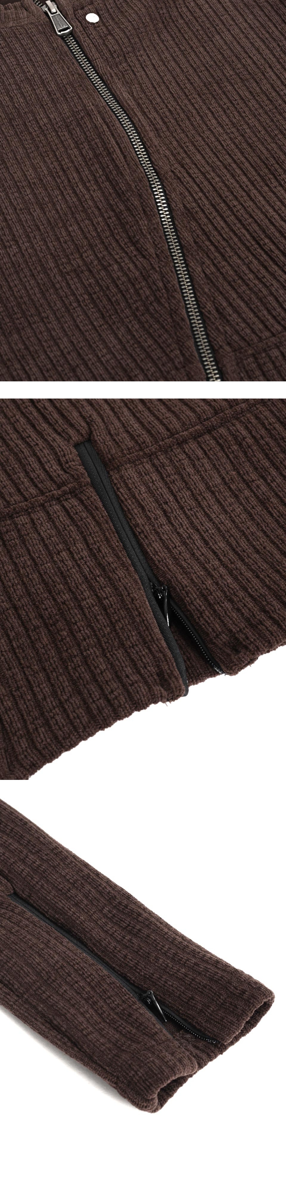겉면의 기모감 있는 소재로 부드러운 터치감 전면 비대칭 지퍼 디자인 베이컨트 제작 YKK 2WAY 지퍼 사용 베이컨트 제작 코어 라인 리벳 장식 사용 소매 지퍼 여밈 디테일