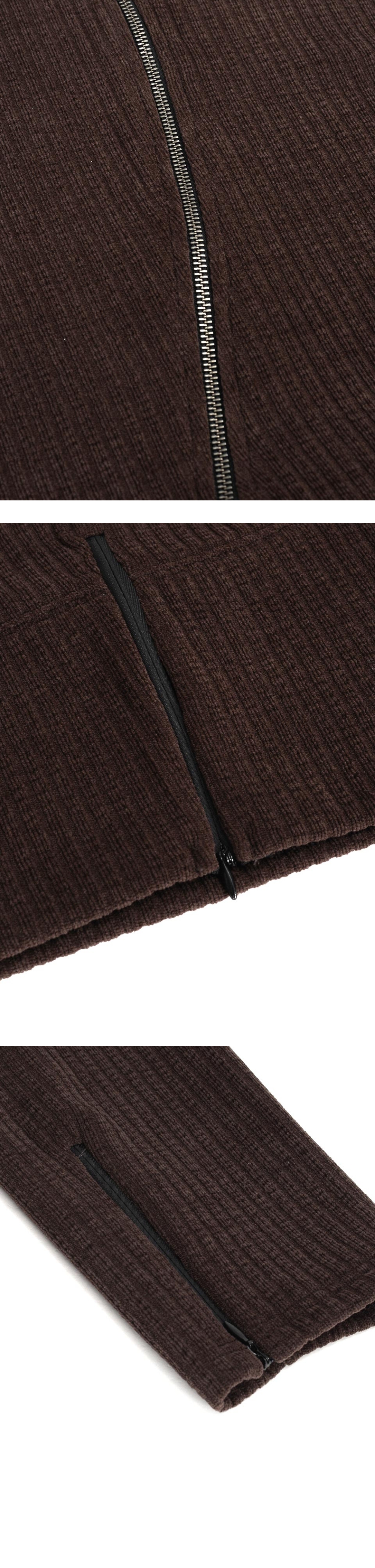 겉면의 기모감 있는 소재로 부드러운 터치감 전면 비대칭 지퍼 디자인 베이컨트 제작 YKK 2WAY 지퍼 사용 베이컨트 제작 코어라인 리벳 장식 사용 소매 지퍼 여밈 디테일
