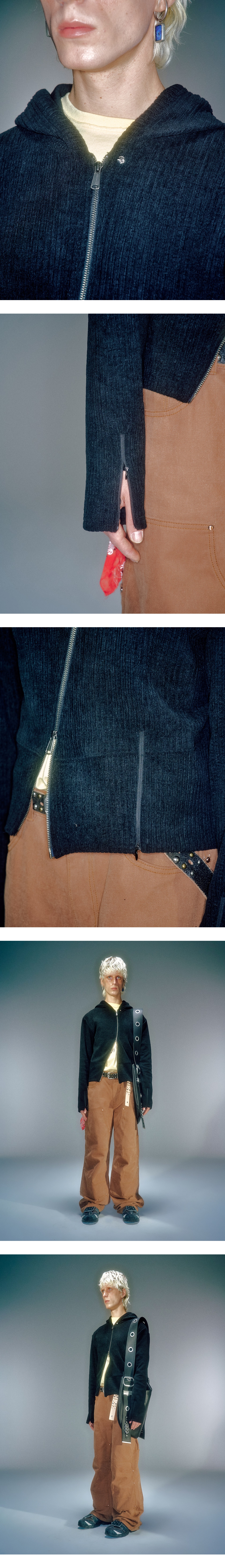 겉면의 기모감 있는 소재로 부드러운 터치감 전면 비대칭 지퍼 디자인 베이컨트 제작 YKK 2WAY 지퍼 사용 베이컨트 제작 코어라인 리벳 장식 사용 소매 지퍼 여밈 디테일