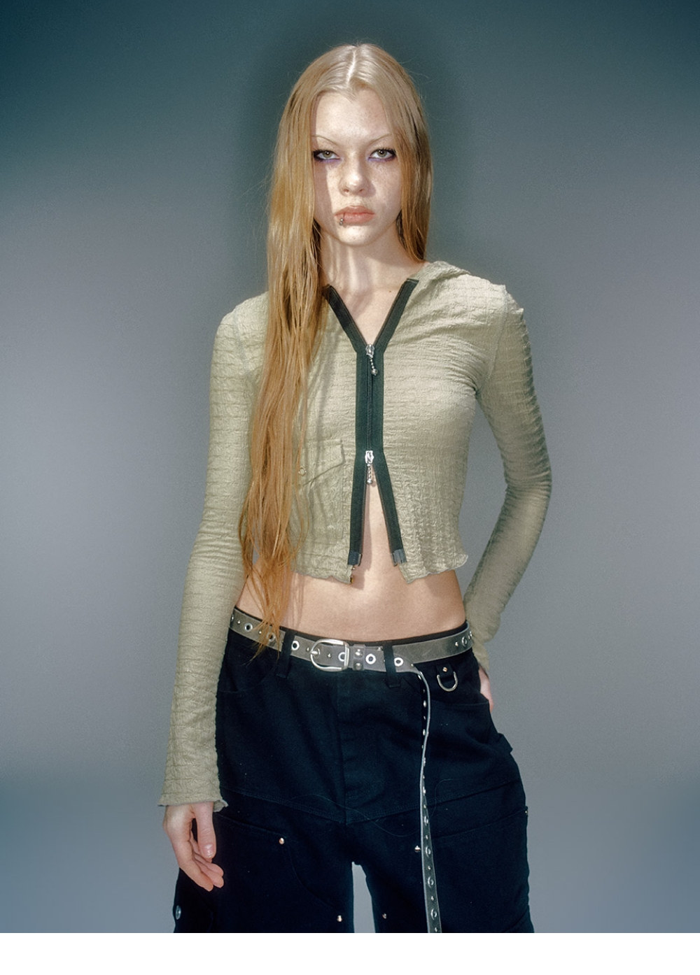 신축성 좋은 얇은 소재로 좋은 통기성과 터치감의 후드 집업 전면 YKK 지퍼 노출 디자인 플레어 라인의 소매 전면 입체 포켓 디테일